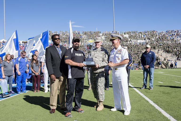| Keywords: CJCS and VCJCS attend Warrior Games Tailgate and AF v Navy football 141004-D-HU462-475.jpg en 18th Chairman of the Joint Chiefs of Staff Gen Martin E Dempsey presents the Chairman's Cup trophy to the Army team captain Frank Barroquiero during halftime at the Air Force versus Navy football game at the U S Air Force Academy's Falcon Stadium in Colorado Springs Colorado Oct 4 2014 DoD photo by Army Staff Sgt Sean K Harp/Released 2014-10-04 Staff Sgt Sean Harp https //www dvidshub net/image/1604926 141004-D-HU462-475 2014-10-08 00 02 UNITED STATES AIR FORCE ACADEMY CO US PD-USGov Martin E Dempsey Falcon Stadium Images from DoD uploaded by Fæ |