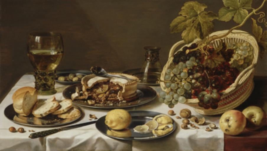 Keywords: Claesz, Pieter - Tabletop Still Life with Mince Pie and Basket of Grapes - 1625.jpg Artwork creator Pieter Claesz 1625 oil panel cm 42 5 74 private collection accession number object history credit line http //www nga gov/press/exh/217/index shtm http //www nga gov/press/exh/217/assets/217-048-lrg jpg PD-old-100 Paintings by Pieter Claesz 1625 17th-century still life paintings in private collections 1620s still life paintings Oil still life paintings Baroque still life paintings of food Cuisine of the Netherlands in art Rummers in paintings Paintings of grapes 17th-century oil on panel paintings in the Netherlands Pies in art Paintings of lemons Nuts in art Still life paintings of bread 17th-century still life paintings of fruit baskets 18th-century paintings in unidentified private collections Uploads by Mattes from external sources Berkemeyers in paintings Flower baskets in art ImageNote 1 30 48 69 107 420 238 2 rummer ImageNoteEnd 1 ImageNote 2 212 68 63 71 420 238 2 berkemeyer ImageNoteEnd 2 |