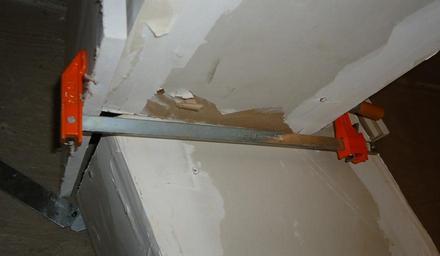 Keywords: Clamp used to secure sheetrock to free hands to drill.jpg en A handyman project to enclose PVC drain pipes in a 12 foot-high garage ceiling Building regulations require at least 1 of firecode sheetrock protecting the pipes to prevent a possible fire from spreading A clamp holds sheetrock in place prior to drilling screws to secure it 2012-07-04 own Tomwsulcer cc-zero Uploaded with UploadWizard Construction tools