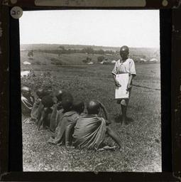 Keywords: Class of Children Learning Outdoors, Kenya, ca.1905-ca.1940 (imp-cswc-GB-237-CSWC47-LS7-020).jpg en <br> Class of Children Learning Outdoors Kenya ca 1905-ca 1940 Photograph of a group of 9 young boys being taught outdoors An older boy is facing the group of younger boys who are sitting in a line on the ground he is holding a card and pointing to words written on it This is possibly a reading class The roofs of thatched huts can be seen in the distance ; This belongs to a series of Church of Scotland Foreign Missions Committee lantern slides relating to the Kikuyu Mission in Kenya which was set up by Church of Scotland missionaries Hospitals were established by Scottish missionaries in Kikuyu in 1908 in Tumutumu in 1909 and in Chogoria in 1922 The missionaries also introduced the Presbyterian Church to the area The Kikuyu are Kenyaas most populous ethnic group Photographer Unknown Filename imp-cswc-GB-237-CSWC47-LS7-020 tif Coverage date 1905/1940 Part of collection International Mission Photography Archive ca 1860-ca 1960 Type images Part of subcollection Photographs from the Centre for the Study of World Christianity University of Edinburgh U K ca 1900-ca 1940s Repository name Centre for the Study of World Christianity Archival file impaunpub_Volume7/1629 url Repository address The University of Edinburgh School of Divinity New College Mound Place Edinburgh EH1 2LX United Kingdom Geographic subject country Kenya Format aacr2 1 lantern slide 8 x 8 cm Geographic subject continent Africa Rights Contact the repository for details Part of series Kenya Mission LS7 Repository email divinity-CSWC ed ac uk Subject lcsh Keyword Education; Children Date created 1905/1940 Publisher of the digital version University of Southern California Libraries Subject aat genre group portraits Format aat lantern slides Legacy record ID impa-m68734 Access conditions http //www ed ac uk/schools-departments/divinity/research/centres/world-christianity/collections-resources File GB 237 CSWC47/LS7/20 1905/1940 author http //digitallibrary usc edu/cdm/ref/collection/p15799coll123/id/64759 PD-old-70-1923 Magic lantern images Images from USC Digital Library uploaded by Fæ International Mission Photography Archive ca 1860-ca 1960