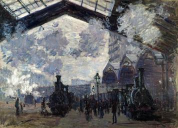 | Keywords: Claude Monet, The Gare St-Lazare, 1877.jpg  Artwork en After his return to France from London Monet lived from 1871-78 at Argenteuil on the Seine near Paris In January 1877 he rented a small flat and a studio near the Gare St-Lazare and in the third Impressionist exhibition which opened in April of that year he exhibited seven canvases of the railway station This painting is one of four surviving canvases representing the interior of the station Trains and railways had been depicted in earlier Impressionist works and by Turner in his 'Rain Steam and Speed' but were not generally regarded as aesthetically palatable subjects Monet's exceptional views of the Gare St-Lazare resemble interior landscapes with smoke from the engines creating the same effect as clouds in the sky Swift brushstrokes indicate the gleaming engines to the right and the crowd of passengers on the platform 1877 Oil on canvas 54 3 x 73 6 cm Institution National Gallery London object history exhibition history credit line Bought 1982 http //www nationalgallery org uk/paintings/claude-monet-the-gare-st-lazare National Gallery London Signed accession number NG6479 PD-old-auto 1926 Saint-Lazare Station by Claude Monet Paintings by Claude Monet in the National Gallery London 1877 in Paris 1877 paintings in France |