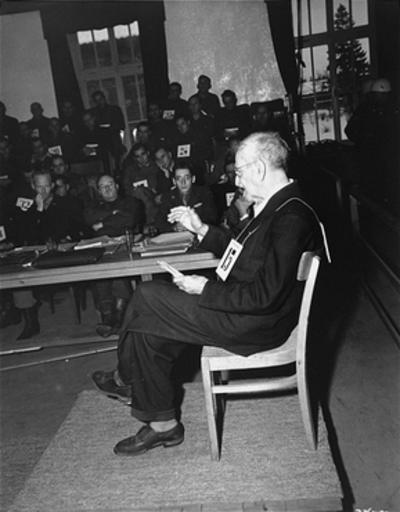 Keywords: Claus Schilling.jpeg en Dr Klaus Karl Schilling a physician who infected over one thousand prisoners with malaria in his experiments at the Dachau camp defends himself at the trial of former camp personnel and prisoners from Dachau USHMM courtesy of National Archives and Records Administration College Park Photograph 82880 Author 1945-12-07 Copyright Public Domain Dr Klaus Karl Schilling a physician who infected over one thousand prisoners with malaria in his experiments at the Dachau camp defends himself at the trial of former camp personnel and prisoners from Dachau In his appeal in English after cross examination Schilling explained I have worked out this great labor It would be really a terrible loss if I could not finish this work I don't ask you as a court I ask you personally to do what you can; to do what you can to help me that I may finish this report I need only a table and a chair and a typewriter It would be an enormous help for science for my colleagues and a good part to rehabilitate myself His voice then broke and he cried The Dachau concentration camp trial opened on November 2 1945 in Dachau Germany Forty individuals who had participated in the operation of the Dachau concentration camp were charged with the murder and mistreatment of foreign nationals imprisoned there Among those charged were Martin Gottfried Weiss the camp commandant from 1942-1943; Dr Klaus Karl Schilling an SS physician who was brought to Dachau to find a method of immunizing people against malaria; and three former prisoners The trial lasted from November 15 to December 13 1945 with seventy witnesses called for the prosecution and fifty witnesses called for the defense All forty defendants were found guilty with thirty-six being sentenced to death by hanging including Weiss and Schilling one sentenced to hard labor for life and three sentenced to hard labor for ten years A few of the sentences were reduced after a review board determined the defendants were involved to a lesser degree than originally believed but most were upheld Those sentenced to death were hanged on May 28-29 1946 at Dachau PD-USGov Klaus Karl Schilling Dachau trial Sitting men |