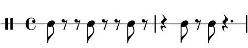 Keywords: Clave 3-2 rhythm.png The 3-2 clave rhythm common in salsa music in music notation self-made rendered from the following LilyPond source code <source lang latex > \version 2 12 2 \score Set up the one-line drum staff \new DrumStaff \with drumStyleTable percussion-style \override StaffSymbol 'line-count 1 \override BarLine 'bar-size 3 The rhythm \drummode cl8 r8 r8 cl8 r8 r8 cl8 r8 r4 cl8 r8 cl8 r4 Output specification \layout \midi Set tempo of output midi file to 180 bpm \context \Score tempoWholesPerMinute ly make-moment 180 4 </source> 2009-10-14 GreenRoot <span class signature-talk >talk</span> Public Domain Salsa music Clave rhythm |