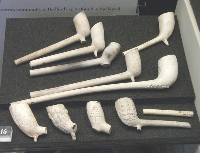 | Keywords: ClayPipesBedfordMuseum.JPG en A group of clay pipes from the early 17th to late 19th century on display in Bedford Museum own Simon Speed 2010-09-15 Photos by Simon Speed Bedford Museum Bedford Clay pipes smoking 17th-century way of life preserved artefacts |
