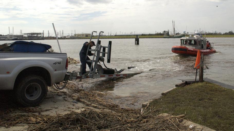 Keywords: Cleaning up damage from Hurricane Ike DVIDS115831.jpg en Coast Guard Petty Officer 3rd Class Rick Ward secures the boat trailer after helping launch a 25-foot small boat and crew into the Sabine River from the loading dock at the Marine Safety Unit in Port Arthur's Small Boat Facility Sept 15 2008 The crew got underway to conduct a pollution response inspection along the river Many boats used the dock as a staging area to launch boats carrying deployable containment boom to place around polluted areas 2008-09-15 Petty Officer 3rd Class Jaclyn Young https //www dvidshub net/image/115831 080916-N-+++++-002 2008-09-16 15 39 PORT ARTHUR US PD-USGov-Military-Navy Hurricane Ike Images from DoD uploaded by Fæ |