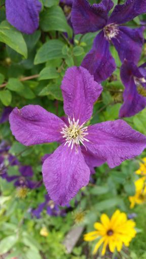 Keywords: clematis flower blossom bloom close purple plant beautiful spring green leaves yellow garden nature flora petals floristry landscape
