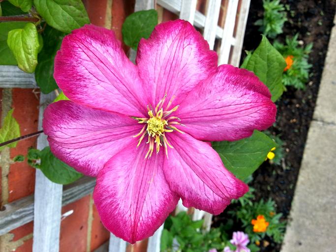 Keywords: clematis flower floral flora flowering plant garden perennial gardening blooming color climbing nature petal pink trellis wall summer