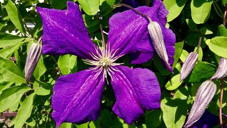 Keywords: clematis purple petals flower four green nature purple flower bloom natural floral blossom bright plant tropical color decoration garden botanical leaf spring pods vine bud budding burst growing open seasonal