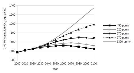 Keywords: Climate change mitigation scenarios (IIASA). Atmospheric greenhouse gas concentrations 2000-2100.png greenhouse gas GHG concentrations between the years 2000 and 2100 for a range of climate change mitigation scenarios GHG concentrations are measured in carbon dioxide-equivalents GtCO<sub>2</sub>-eq in units of parts-per-million by volume ppmv Concentrations include the full basket of GHGs as well as other radiatively active gases such as aerosol and aerosol precursors Projections for 5 scenarios are shown Each scenario is designed to stabilize atmospheric GHG concentrations at a different level 450 520 670 970 and 1390 ppmv A summary table of the graph data is given in a later section References Scenario data can be freely downloaded from International Institute for Applied System Analysis IIASA http //www iiasa ac at/web-apps/ggi/GgiDb/dsd Action htmlpage page about GGI Scenario Database Ver 2 0 2009 Archived https //web archive org/web/20131004192147/http //www iiasa ac at/web-apps/ggi/GgiDb/dsd Action htmlpage page about 4 October 2013 These are the A2r mitigation scenarios 2014-10-29 08 35 48 own Enescot other versions Data Atmospheric GHG concentrations for scenarios 2000 to 2100 wikitable sortable - Scenario Year<br/>2000 2030 2050 2100 - 450 ppmv 369 2 475 5 512 6 441 7 - 520 ppmv 369 2 484 0 548 3 515 1 - 670 ppmv 369 2 492 8 600 1 675 1 - 970 ppmv 369 2 498 7 650 3 985 0 - 1390 ppmv 369 2 502 9 682 9 1349 7 cc-zero Uploaded with UploadWizard Greenhouse gases |