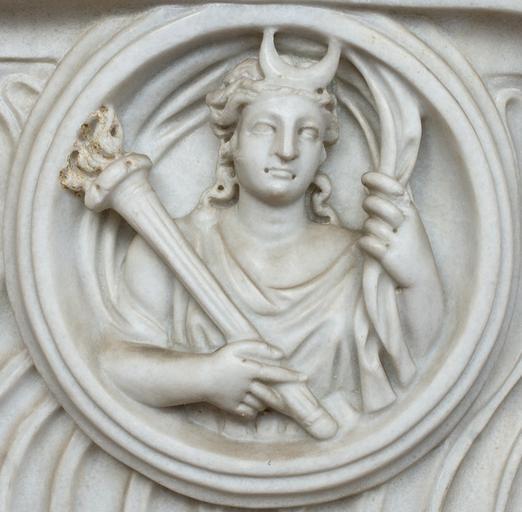 Keywords: Clipeus Selene Terme.jpg Bust of Selene in a clipeus detail from a strigillated lenos sarcophagus Roman artwork Buste de Séléné dans un clipeus détail d'un sarcophage à lenos Œuvre romaine Busto di Selene dentro clipeo dettaglio di uno sarcofago strigilato a lenos Opera romana early other date century 3 AD marble white Museum Terme di Diocleziano Cloister object history From Tomb D in Via Belluzzo Rome Provenance tombe D Via Belluzzo Rome Rinvenuto a Roma via Belluzzo tomba D credit line accession number Marie-Lan Nguyen 2006 other versions Selene in ancient Roman art Ancient Roman reliefs in Rome Museo delle Terme Ancient Roman reliefs in the Museo delle Terme di Diocleziano Rome Ancient Roman sarcophagi in Rome Terme 3rd-century sarcophagi Rome Round reliefs in Rome Terme Torches in art Luna mythology Women with a crescent on their head |