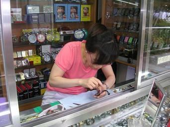 Keywords: Clockmakeratwork.JPG en A clockmaker at work fixing a clock in NamDaeMun Marketplace Seoul Korea own Clementina 2010-08-19 Horological shops Namdaemun Market
