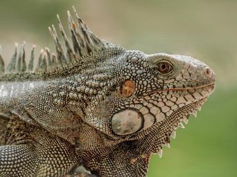 Keywords: iguana lizard dragon head animal side view profile closeup spines scaly tropical green creature eye level iguana