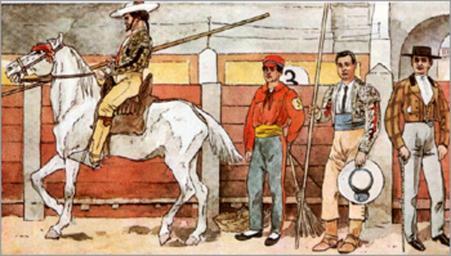 | Keywords: Clothing of Spain Table155-2.jpg  Clothing of Spain Corrida - picadores 1 Пикадо Отк ывает бой нападая на быка с копьем и должен п оде жаться до его пе вого уда а же твой кото ого обычно становится ста ая лошадь уже не п едставляющая ценности У копья ко откое т ехг анное ост ие на кото ое насаживается де евянный валик чтобы не  анить быка се ьезно а только  азд азнить его Большая плоская се ая фет овая шляпа с  озеткой из лент Под кожаными штанами - железные поножи Изящная ку тка не ук ашенная таким множеством кистей 2 Слуга пикадо а Он помогает подняться упавшему пикадо у в то в емя как эспада отвлекает быка на себя 3 Пикадо в удлиненных кожаных ве хних штанах 4 Участник боя быков в повседневной одежде History of costume http //silveromsk virtbox ru/moda/index152-2 html century 19 anonimous PD-Art Clothing of Spain Files uploaded by Shakko from various sources Bullfighting costumes Sombreros |