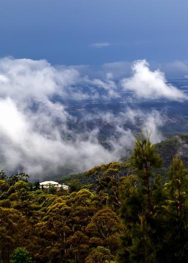 Keywords: clouds blue sky white hills trees house view fluffy distance