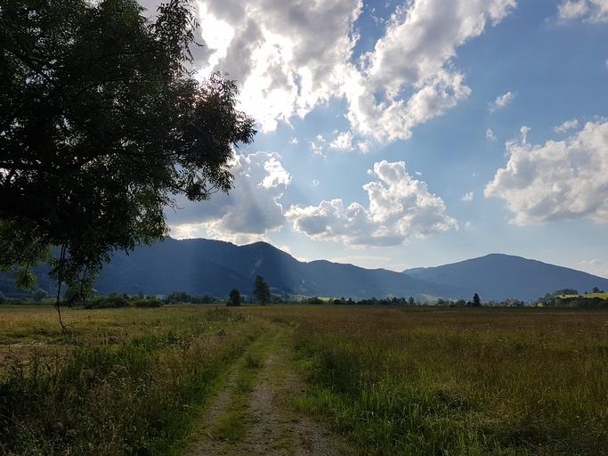 Keywords: clouds sky alpine foothills of the alps panorama moor meadow pasture tree aesthetic mountains lane trail bavaria