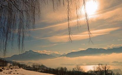 Keywords: clouds sun sky blue rays sunbeam morning sunburst back light sunset mood snow landscape nature bushes bush water trees lake mountains fog haze sparkle