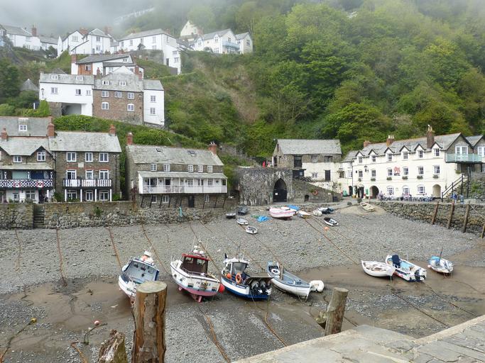 Keywords: clovelly cornwall england united kingdom fishing boats port fog ebb mountain homes village