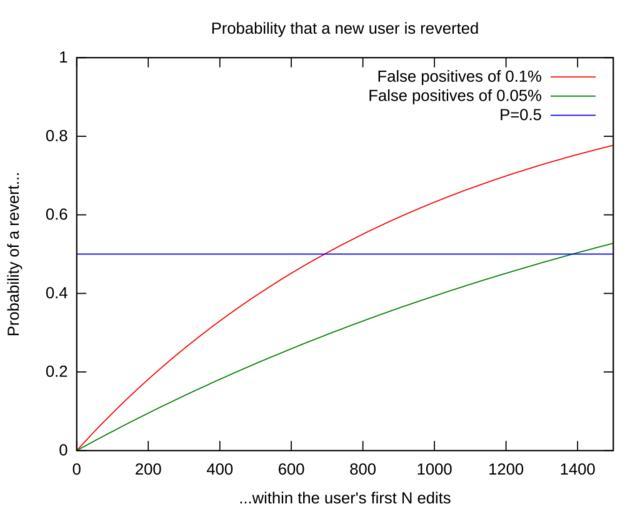 | Keywords: ClueBot NG new user revert probability.svg Check categories 2013 July 24 en This shows the probability that a new user is reverted by w User ClueBot NG within their first N edits assuming ClueBot looks at every edit made and does no post-processing The red line is the current setting of a 0 1 false positive rate; the green line is a previously used setting of a 0 05 false positive rate The blue line is at P 0 5 for reference The point at which the red/green line crosses the blue line is the point at which a user has a 50 probability given their number of edits of having been incorrectly reverted at least once 2012-08-15 own NYKevin DrTrigonBot <span class signature-talk >talk</span> FileContentsByBot/ColorRegions FileContentsByBot/ColorRegions 1 000 0 020 PMS 11-0601 TPX Bright White Pantone 241 242 241 2 912 247 247 247 1 000 0 0 596 475 1 119 1 298 237 FileContentsByBot/ColorAverage 0 014 PMS 11-0601 TPX Bright White Pantone 241 242 241 0 048 248 248 248 0 036 1 190 FileContentsByBot/Properties - 600 480 Invalid SVG image/svg+xml - 10907 FileContentsByBot/Metadata - Produced by GNUPLOT 4 4 patchlevel 3 - - - Source code gnuplot This code is also in the public domain covered by the CC-0 waiver Note that a line has been broken with a backslash; this needs to be the last character on that line <source lang gnuplot >set terminal svg set output '~/foo svg' set title 'Probability that a new user is reverted' set ylabel 'Probability of a revert ' set xlabel within the user's first N edits plot 0 1500 0 1 1 - 999 x title 'False positives of 0 1 ' with lines \ 1 - 9995 x title 'False positives of 0 05 ' with lines 0 5 title 'P 0 5' with lines</source> cc-zero ImageNote 1 275 215 63 49 600 480 2 X http //www wolframalpha com/input/ i 1-0 999 x 3D0 5 692 8 at the point of intersection between the red and blue lines ImageNoteEnd 1 ImageNote 2 516 216 50 44 600 480 2 X http //www wolframalpha com/input/ i 1-0 9995 x 3D0 5 1386 0 at the point of intersection between the green and blue lines ImageNoteEnd 2 Categorized by DrTrigonBot Graphics Created with GNU Octave Uploaded with UploadWizard |
