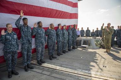 | Keywords: CNO visits sailors 131128-N-WL435-107.jpg en Chief of Naval Operations Adm Jonathan Greenert and Master Chief Petty Officer of the Navy Mike Stevens re-enlist sailors aboard the guided-missile cruiser USS Gettysburg CG 64 during a visit where the two had lunch and held an all-hands call on Thanksgiving Day Greenert and Stevens wanted to spend time with members of their Navy-Marine Corps family during the Thanksgiving holiday period to show their support and appreciation for the many men and women who serve in the military U S Navy photo by Chief Mass Communication Specialist Peter D Lawlor/Released 2013-11-28 Petty Officer 1st Class Peter Lawlor https //www dvidshub net/image/1064370 131128-N-WL435-107 2013-12-02 23 17 GULF OF OMAN AT SEA PD-USGov-Military-Navy Jonathan W Greenert in 2013 USS Gettysburg CG-64 Images from DoD uploaded by Fæ |