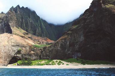 Keywords: coast rocks mountains cliffs steep vertical high big massive shore beach landscape fog scenic seascape
