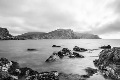 Keywords: coast shore rocks stones wild water ocean sea waves exposure motion scenic coastline outdoor seascape seaside blurred weather black and white