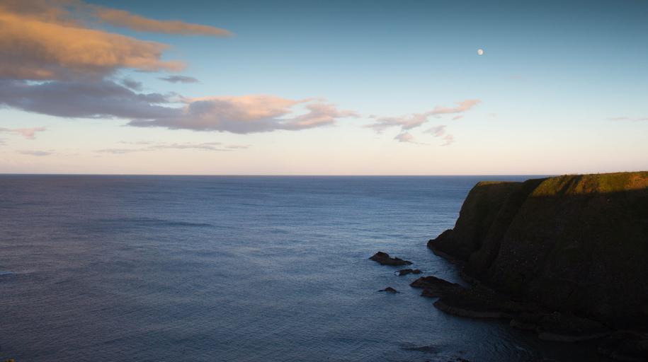 Keywords: coastal view moon lunar full bright twilight dusk evening sunset ocean sea water horizon clouds calm tranquil peacefull cliff bluff rock seascape panoramic shore coast