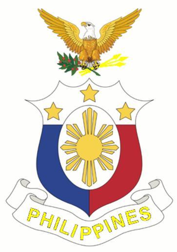 | Keywords: Coat of Arms of the Philippines (Commonwealth).gif File Coat of arms of the Philippines 1940-1941 svg en Coat of Arms of the Philippines Arms ” Paleways of two pieces dexter azure and sinister gules; a chief white bearing three mullets or dexter center and sinister; an oval field white emblazoning at the honor point the symbolic eight-rayed sun in rayonnant or each ray-flanked on both sides by lesser and minor rays or Crest ” The American eagle proper The right talon grasping an olive branch with eight leaves vert and eight fruits gules and the left talon grasping three spears or Beneath a scroll argent with the word Philippines or inscribed thereon 2012-11-04 00 35 24 Malacanan Presidential Museum http //www gov ph/downloads/1917/03mar/19170310-Act-2711 pdf www gov ph amendments COMMONWEALTH ACT NO 602 Commonwealth of the Philippines Custom license marker 2012 11 03 PD-USGov Uploaded with UploadWizard Historical coats of arms of the Philippines ImageNote 1 57 208 190 159 300 426 2 Paleways of two pieces dexter azure and sinister gules ImageNoteEnd 1 ImageNote 2 28 134 245 77 300 426 2 chief white bearing three mullets ImageNoteEnd 2 ImageNote 3 92 180 126 140 300 426 2 dexter center and sinister; an oval field white emblazoning at the honor point the symbolic eight-rayed sun in rayonnant or each ray-flanked on both sides by lesser and minor rays ImageNoteEnd 3 ImageNote 4 51 7 226 123 300 426 2 The American eagle proper ImageNoteEnd 4 ImageNote 5 75 86 78 44 300 426 2 The right talon grasping an olive branch with eight leaves vert and eight fruits gules ImageNoteEnd 5 ImageNote 6 150 87 70 42 300 426 2 the left talon grasping three spears ImageNoteEnd 6 ImageNote 7 2 302 297 117 300 426 2 Beneath a scroll argent with the word Philippines or inscribed thereon ImageNoteEnd 7 |