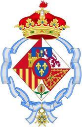 | Keywords: Coat of Infanta Elena of Spain, Duchess of Lugo.png Coat of Infanta Elena of Spain Duchess of Lugo svg en Coat of arms of Infanta Elena of Spain Duchess of Lugo <br /> Current version used after her divorce<br />The Royal arms of Spain differenced by Three-point label with a Chalice and Eucharistic bread from the Coat of arms of Lugo Vector elements from File Armas atribuidas a Letizia Ortiz como Princesa de Asturias svg File Escudo del rey de España abreviado antes de 1868 con toisón svg Image Escut dels Prats de Rei svg Image Armas de Navarra svg Image Blason Simon de Bentheim svg Image Escudo de Almisera svg File Escudo de la provincia de Lugo svg Escudo de la Infanta Elena de España <br /> Versión atribuida después de su divorcio <br />Escudo cuartelado y entado en punta en el 1º de gules con un castillo de oro almenado mazonado de sable y aclarado de azur que es de Castilla; en el 2º de plata con un eón rampante de gules coronado de oro lampasado y armado de lo mismo que es de León; en el 3º de oro con cuatro palos de gules que es de Aragón; en el 4º de gules con una cadena de oro puesta en orla en cruz y en aspa con un punto de sinople en abismo que es de Navarra; en el 5º entado en punta de plata con una granada al natural rajada de gules sostenida tallada y hojada de dos hojas de sinople que es de Granada Sobre el todo un escusón de azur con tres flores de lis de oro bordura de gules que es de Borbón El todo diferenciado con un lambel de azur de tres pendientes cargado el central de un cáliz de oro sumado a su vez de hostia de plata radiante de oro muebles piezas de las armas de Lugo Al timbre corona de infantes y rodeado de la banda de la Gran Cruz de la Orden de Carlos III es icon http //blogdeheraldica blogspot com/2009/04/conceptos-heraldicos-iv-la-brisura-en html Cadency of the Spanish Royal House José Juan Carrión Rangel Blog de Heráldica Label tincture correction Azure / Esmalte del lambel corregido De Azur <br/> Proyecto Galicia Serie de Heráldica Genealogía y Nobiliaria T V LVIII La Coruña Hércules de Ediciones 2011 ISBN 978-84-92715-31-2 P 529 Buho07 2008-10 Own work 40px Crowned lion gules of León in heraldry Order of Charles III in heraldry Labels of three points azure Coats of arms of the Spanish Royal Family Eucharist in heraldry Lozenge-shaped heraldic shields Heraldic crowns of Spanish Infantes Arms of Spain Infanta Elena Duchess of Lugo |