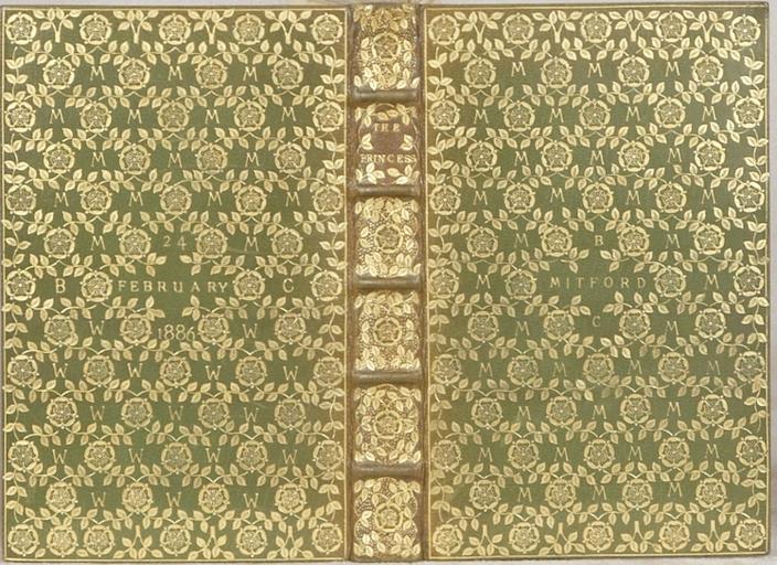| Keywords: Cobden-Sanderson Binding 1886 The Princess for Mitford.png A book bound 1886 by Thomas James Cobden-Sanderson for Clementine Mitford as a gift for her husband Bertram Mitford <br /> The book is The Princess 1847 by Lord Alfred Tennyson 1809-1892 <br /> Comments to the quality of the binding The binder's notes observe that the design of back-side varies from front The 'M' is inverted in the lower half of the back This an accident is a great improvement Time 54 3/4 hours Undercharged Url http //www pirages com/pages/books/ST11727p/alfred-lord-bindings-cobden-sanderson-tennyson/the-princess 1 ˆ’ a superstar binding in all ways - it is being offered for 65 000 Url http //www booktryst com/2011/10/65000-binding-bound-to-be-great html Boktryst A Nest for Book Lovers 2011 http //www pirages com/pictures/ST11727p jpg - Url http //www pirages com/pages/books/ST11727p/alfred-lord-bindings-cobden-sanderson-tennyson/the-princess with its provenance - Url http //www pirages com/advSearchResults php action search keywordsField cobden-sanderson via 2 1886 Thomas James Cobden-Sanderson 1840-1922 PD-Old Thomas James Cobden-Sanderson Book covers from the United Kingdom Leather-bound books |