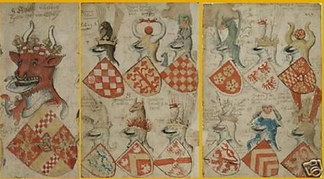 | Keywords: Codex-148-armorial-quinzieme-siecle.jpeg en Text is from web page on http //cgi benl ebay be/Heraldry-Heraldik-Heraldiek-Heraldique-Armorial-Wappen-/200362992737 Ebay CODEX 148 Armorial inédit du quinzième siècle Blasonnements des 124 armoiries du Ms 148 des Codices Selecti notices bio-bibliographiques sur chacun des Sires et quelques Dames et dont une importante série de Chevaliers de l'Ordre de la Toison d'Or Tirage à part en feuilles détachées de l'Armorial en couleurs sous farde http //cgi benl ebay be/Heraldry-Heraldik-Heraldiek-Heraldique-Armorial-Wappen-/200362992737 Author century 15 PD-old Related files <gallery> File Antoine de Vergy jpg File Blason Vergy svg File Pierre de Bauffremont jpg File Jean V de Créquy jpg File Blason Charles III de Créqui svg File Simon de Lalaing 1405-1477 jpg File Blason Famille de Lalaing svg File Philippe Seigneur de Ternant jpg </gallery> Coats of arms of families of Germany Marshalled Cleves and Mark County of Mark Coats of arms of families of Belgium Coats of arms of families of France Coats of arms of the House of Beaufremont Swans in crest Vairy Or and gules Armorial codex 148 Pierre de Bauffremont Antoine de Vergy Guy de Pontailler Jacques de CrèvecÅ“ur David de Brimeu Luxemburg dynasty Jean de Créquy Simon de Lalaing 1405-1477 Philippe de Ternant Guilbert de Lannoy Jean de Luxembourg-Haubourdin Unicorns in coats of arms of families of Belgium Lannoy Guilbert de Unicorns in crest Lannoy Guilbert de Coats of arms of the county of Ravensberg ImageNote 1 189 7 69 152 500 277 2 Jehan Signour de Crequi 1395-1474 ImageNoteEnd 1 ImageNote 2 373 150 66 125 500 277 2 Jaques Signour de Crevecur ImageNoteEnd 2 ImageNote 3 435 28 58 122 500 277 2 Piere de Beffremont 1400-1472 ImageNoteEnd 3 ImageNote 4 127 9 60 148 500 277 2 Symon de Lalain 1405 “1476 ImageNoteEnd 4 ImageNote 5 439 150 52 122 500 277 2 Guly de Pontailliez ImageNoteEnd 5 ImageNote 6 312 6 61 143 500 277 2 Antoine de Vergy 1375-1439 ImageNoteEnd 6 ImageNote 7 1 4 117 268 500 277 2 Kleve-Mark ImageNoteEnd 7 ImageNote 8 312 150 58 123 500 277 2 Jehan bastaert de Santpoel 1400-1466 ImageNoteEnd 8 ImageNote 9 374 6 59 142 500 277 2 Jaque de Brimeur ImageNoteEnd 9 ImageNote 10 189 160 50 114 500 277 2 Jehan de la Clite ImageNoteEnd 10 ImageNote 11 127 160 58 111 500 277 2 Gillebert de Lannoy 1386 “ 1462 ImageNoteEnd 11 ImageNote 12 239 161 63 112 500 277 2 David de Brimeu ImageNoteEnd 12 ImageNote 13 259 7 46 150 500 277 2 Philippe Sire de Ternant 1400-1456 ImageNoteEnd 13 |