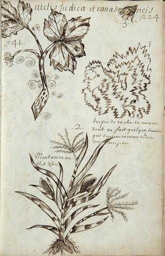 | Keywords: Codex canadensis, p. 24.jpg  fr Codex canadensis p 24<br> 1 tripe de roche ou mousse / dont on fait quelque boulion / qui devient comme de la cole / tres Incipide<br>2 Mentamin ou / bled dInde <br>3 Victis indica et canadencis en 1 Tripe de roche or moss from which a bouillon is made which becomes like a very insipid glue <br>2 Mentamin or Indian corn <br>3 upper left Vitis indica et canadensis ca 1675-82 http //www collectionscanada gc ca/codex/026014-1100-f html Louis Nicolas 1634 - ca 1682 other versions PD-old-100 Codex canadensis Uploaded with UploadWizard |
