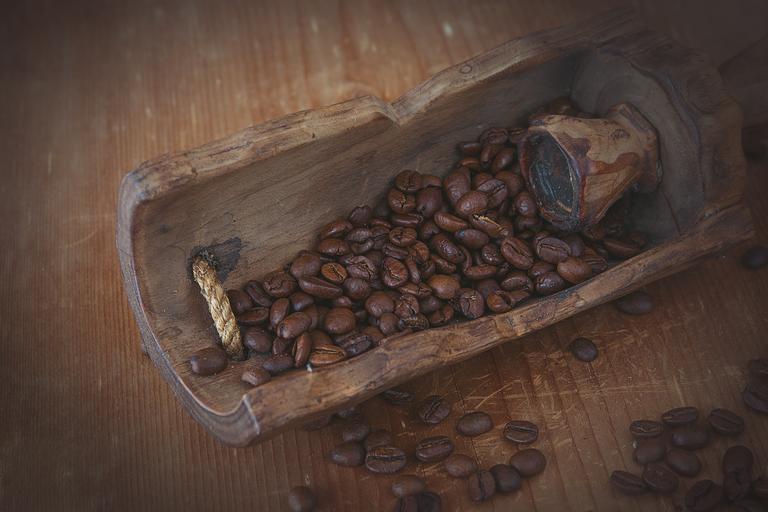 Keywords: coffee coffee beans roasted brown dark natural product caffeine wooden shovel wood close