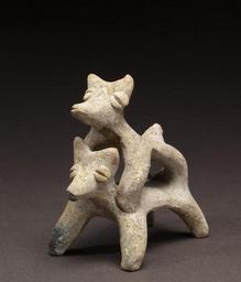 | Keywords: Colima - Group of Figurines and Architectural Model - Walters 20092033 - Three Quarter Front.jpg Narrative groupings of figurines in architectural settings have been found throughout Mesoamerica in contexts dating as early as the Middle Formative Period 900-400 BCE Some are made from jadeite and similar precious stones such as an Olmec ceremonial scene of sixteen figurines arranged in a semicircle and framed by six column-like celts Others are composed of modeled ceramic figures depicting a burial or ancestor veneration rite complete with elaborately dressed performers and musicians like that found above Tomb 103 at Monte Albán Oaxaca The objects that constitute these figure groups generally share the same aesthetic style and manufacturing technique which suggests they were made at the same time as a single artistic statement The disparate artistic styles and technical features suggest that these nine Colima figurines and one building model might be a modern grouping although dissimilar figurines have been documented in figure groupings found in the same tomb In this instance archaeological confirmation is not available The figurine types represent at least two styles from Colima-Jalisco including the Tuxcacuesco-Ortices type nos 33 3 33 8 and 33 9 and two from the Colima-Jalisco border region nos 33 4 and 33 5 The house model no 33 1 depicts a typical West Mexican domicile or ceremonial building without its basal earthen platform No architecture of comparable form is found in the region because these structures were made of perishable materials; only the earth-and-stone platforms have survived although many have been destroyed by modern agricultural activities These architectural models thus document the lost architectural heritage of ancient West Mexico The figures portray men and women performing both ritual and daily activities from mothers tending children nos 33 3 and 33 8 and grinding maize no 33 7 to men drumming no 33 6 or sitting regally and brandishing a fanlike scepter no 33 9 A seated hunchback figure which also is a whistle sports an elaborate head wrap and fine jewelry no 33 10 A dog-standing-atop-a-dog sculpture and two seated men with elongated heads complete the group nos 33 2 33 4 and 33 5 This elongated-head figurine style is associated with the northern Colima-Jalisco region and dates to the later years of the Comala phase ca 200-300 CE 200 BC-AD 400 earthenware 1 cm 16 9 13 1 13 7 ; 2 H 3 3/4 x L 3 13/16 x W 2 1/16 in 9 5 x 9 7 x 5 3 cm ; 3 cm 10 3 7 7 4 8 ; 4 cm 7 1 4 1 2 3 ; 5 cm 7 3 4 7 2 3 ; 6 cm 9 1 6 2 6 3 ; 7 cm 14 6 7 8 12 7 ; 8 cm 12 1 8 4 5 5 ; 9 cm 8 9 6 9 10 1 ; 10 cm 7 5 1 5 2 accession number 2009 20 33 80188 John G Bourne date and mode of acquisition unknown Walters Art Museum Gift of John Bourne 2009 place of origin Colima Mexico Walters Art Museum license Objects from Colima in the Walters Art Museum Media contributed by the Walters Art Museum needs category review Dogs in Pre-Columbian art |