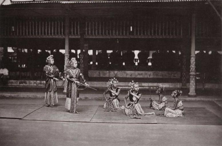 Keywords: COLLECTIE TROPENMUSEUM Danseressen aan het hof van de Sultan van Jogjakarta TMnr 60046818.jpg en A group of four srimpi another category of court-dancers performing a scene from the Putri Cina story in the Kraton Each character is played by two dancers The character at left is the Chinese princess Dewi Adaninggar who tries to kill her rival in love princess Kelaswara This picture is plate VIII of Isaäc Groneman's In den Kedaton te Jogjåkartå G Knaap 1999 nl Foto Danseressen aan het hof van de Sultan van Jogjakarta ca 1884 institution Tropenmuseum KIT-source 60046818 Creator Kassian Cephas KIT-license PD-old-100 Women of Yogyakarta Dancers from Java Kraton of Yogyakarta Photographs by Kassian Cephas Images from KIT Voorstelling Activiteit / Functie - decors podiumbenodigdheden 19th-century photographs of Indonesian dance 1884 Black and white photographs Isaäc Groneman |