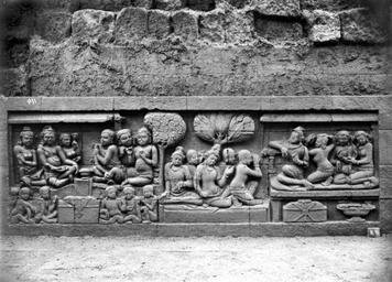 Keywords: COLLECTIE TROPENMUSEUM Reliëf O 67 op de verborgen voet van de Borobudur TMnr 10015805.jpg nl Negatief Negatief waarop reliëf O 67 van de verborgen voet van de Borobudur te zien is De verborgen voet van de Borobudur is de oorspronkelijke basis van het Buddhistische heiligdom dat rond 800 gebouwd is In een latere fase van de bouw werd deze basis verborgen waarschijnlijk om verzakking te verkomen De verborgen voet loopt om het hele bouwwerk heen en bevat 160 reliëfs die tezamen de Mahakarmawibhangga verbeelden een Mahayanistische tekst die de werking van de leer van Karma uiteenzet Deze leerrede wordt aan Buddha toegeschreven en handelt over oorzaak en gevolg N J Krom en Th van Erp duiden in hun standaardwerk over de Borobudur Beschrijving van Barabudur Den Haag Martinus Nijhoff 1920-1931 de reliëfs van de verborgen voet aan als serie O Op de reliëfs zijn voorbeelden van de theorie uitgebeeld goede daden hebben goede gevolgen en slechte daden hebben slechte gevolgen De reliëfs vallen in twee delen uiteen O 1 tot en met O 117 verbeelden een aantal daden die leiden tot één en hetzelfde gevolg De reliëfs O 118 tot en met O 160 tonen verschillende gevolgen van één oorzaak De uiteenzetting van de leer begint bij de trap aan de oostzijde en ontrolt zich met de klok mee om het bouwwerk heen De reliëfs moeten dan ook gelezen worden van rechts naar links Lange tijd was onbekend wat op de reliëfs van de verborgen voet stond afgebeeld Hoewel de reliëfs al in 1885 waren ontdekt door Dr Ir J W IJzerman 1851-1932 kon de Franse geleerde Sylvain Lévi pas in 1929 op het zesde Congres van het Oostersch Genootschap constateren dat het op de verborgen voet ging om een Buddhistische tekst Mahakarmawibhangga Lévi had in 1922 een manuscript uit 1411 met deze tekst ontdekt in Kathmandu Nepal De tekst bleek populair in de Burdhistische wereld te zijn en een aantal verwante teksten te hebben twee Chinese werken waarvan één vertaald was in 582 door Gautama Dharmaprajna en één tussen 980 en 1000 door T'ien si Tsai Daarnaast bevat de Tibetaanse Kanjur twee werken met de titel Karmawibhangga In 1933 publiceerde de archeoloog N J Krom een uitgebreide analyse van het Mahakarmawibhangga op de reliëfs van de bedolven voet Hierin legt hij een relatie tussen de afbeeldingen op de reliëfs en de tekstpassages in het Mahakarmawibhangga Reliëf O 67 bevindt zich aan de westzijde van de Borobudur en correspondeert volgens N J Krom met de twaalfde paragraaf van het Mahakarmawibhangga Wat is de daad die een groot bezit ten gevolge heeft Antwoord het afzien van het nemen van wat niet gegeven is; het anderen afhouden van het nemen van wat niet gegeven is; het zich erover verheugen wanneer anderen ervan afzien te nemen wat niet gegeven is; het schenken van levensonderhoud aan vader en moeder; het schenken van levensonderhoud aan edele deugdzame lieden; desgelijks het schenken van levensonderhoud aan anderen zieken kinderen grijsaards en ellendigen; tevredenheid met het voordeel van een ander; ontevredenheid wanneer een ander geen voordeel heeft; het zich zeer verheugen in andermans voordeel; het genoegen scheppen in een goede oogst Zo ook Dat is de daad die een groot bezit ten gevolge heeft Uit N J Krom Het Karmawibhangga op Barabudur Mededeelingen der koninklijke academie van wetenschappen afdeeling letterkunde deel 76 serie B No 8 Amsterdam Noordhollandsche Uitgevers-Maatschappij 1933 231 Deze passage heeft betrekking op de reliëfs O 66 tot en met O 73 Deze reliëfs tonen een aantal personen die getuige zijn van een uitdeling Pp het linkertafereel zijn rijke personen afgebeeld; er staan opgestapelde schatten afgebeeld en de personen bevinden zich in een aanzienlijke omgeving Op deze reliëfs is de goede oogst uit de tekst achterwege gelaten Op reliëf O 67a zijn een aantal personen in gesprek in een paviljoen Krom merkt op dat het zonder de tekst niet mogelijk zou zijn hieruit af te leiden dat deze personen ervan afzien om te nemen wat niet gegeven is en dat zij zich hierover verheugen Bronnen A J Bernet Kempers Borobudur Mysteriegebeuren in steen Verval en restauratie Oudjavaans volksleven Wassenaar 1973/gewijzigde herdruk ; Van Erp Th Krom N J Beschrijving van Barabudur Den Haag Martinus Nijhoff 1920-1931 ; N J Krom Het Karmawibhangga op Barabudur Mededeelingen der koninklijke academie van wetenschappen afdeeling letterkunde deel 76 serie B No 8 Amsterdam Noordhollandsche Uitgevers-Maatschappij 1933 Reliëf O 67 op de verborgen voet van de Borobudur 1890-1891 institution Tropenmuseum KIT-source 10015805 Creator Kassian Cephas Borobudur in 1890 Black and white photographs