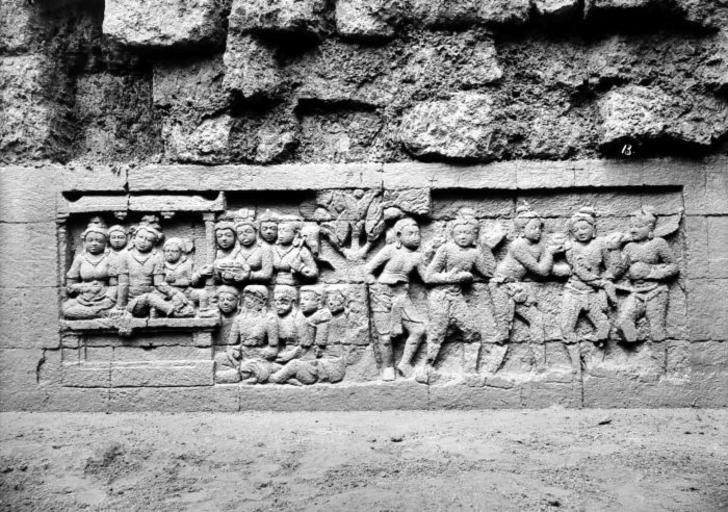 | Keywords: COLLECTIE TROPENMUSEUM Reliëf O 8 op de verborgen voet van de Borobudur TMnr 10015746.jpg nl Negatief Negatief waarop reliëf O 8 van de verborgen voet van de Borobudur te zien is De verborgen voet van de Borobudur is de oorspronkelijke basis van het Buddhistische heiligdom dat rond 800 gebouwd is In een latere fase van de bouw werd deze basis verborgen waarschijnlijk om verzakking te verkomen De verborgen voet loopt om het hele bouwwerk heen en bevat 160 reliëfs die tezamen de Mahakarmawibhangga verbeelden een Mahayanistische tekst die de werking van de leer van Karma uiteenzet Deze leerrede wordt aan Buddha toegeschreven en handelt over oorzaak en gevolg N J Krom en Th van Erp duiden in hun standaardwerk over de Borobudur Beschrijving van Barabudur Den Haag Martinus Nijhoff 1920-1931 de reliëfs van de verborgen voet aan als serie O Op de reliëfs zijn voorbeelden van de theorie uitgebeeld goede daden hebben goede gevolgen en slechte daden hebben slechte gevolgen De reliëfs vallen in twee delen uiteen O 1 tot en met O 117 verbeelden een aantal daden die leiden tot één en hetzelfde gevolg De reliëfs O 118 tot en met O 160 tonen verschillende gevolgen van één oorzaak De uiteenzetting van de leer begint bij de trap aan de oostzijde en ontrolt zich met de klok mee om het bouwwerk heen De reliëfs moeten dan ook gelezen worden van rechts naar links Lange tijd was onbekend wat op de reliëfs van de verborgen voet stond afgebeeld Hoewel de reliëfs al in 1885 waren ontdekt door Dr Ir J W IJzerman 1851-1932 kon de Franse geleerde Sylvain Lévi pas in 1929 op het zesde Congres van het Oostersch Genootschap constateren dat het op de verborgen voet ging om een Buddhistische tekst Mahakarmawibhangga Lévi had in 1922 een manuscript uit 1411 met deze tekst ontdekt in Kathmandu Nepal De tekst bleek populair in de Burdhistische wereld te zijn en een aantal verwante teksten te hebben twee Chinese werken waarvan één vertaald was in 582 door Gautama Dharmaprajna en één tussen 980 en 1000 door T'ien si Tsai Daarnaast bevat de Tibetaanse Kanjur twee werken met de titel Karmawibhangga In 1933 publiceerde de archeoloog N J Krom een uitgebreide analyse van het Mahakarmawibhangga op de reliëfs van de bedolven voet Hierin legt hij een relatie tussen de afbeeldingen op de reliëfs en de tekstpassages in het Mahakarmawibhangga Reliëf O 8 bevindt zich aan de oostzijde van de Borobudur en correspondeert volgens N J Krom met de tweede paragraaf van het Mahakarmawibhangga Wat is dan de daad die een lang leven ten gevolge heeft Antwoord het afzien van de aanslag op het leven; het prijzen van het afzien van de aanslag van het leven; het aanzetten daartoe; het prijzen daarvan; het vrijlaten van wezens die ter dood gedoemd zijn mensen vee varkens hanen enz ; het geven van veiligheid aan wezens in angst; de gedachte van mededogen temidden van verlaten wezens; de gedachte van welwillendheid temidden van uitgeputte wezens en ook van anderen kinderen en grijsaards; ook het geven van voedsel aan hen; de gedachte van welwillendheid voor degenen die de gave ontvangen Hetgeen hiervoor gezegd is van het aanschouwen van strijd enz in goede zin; ook het herstellen van vervallen stupa's caitya's en kloosters Dat is de daad die een lang leven ten gevolge heeft Uit N J Krom Het Karmawibhangga op Barabudur Mededeelingen der koninklijke academie van wetenschappen afdeeling letterkunde deel 76 serie B No 8 Amsterdam Noordhollandsche Uitgevers-Maatschappij 1933 220 Op reliëf O 8 is de vrijlating van gevangenen te zien die door een beul begeleid worden Op O 8b is een aanzienlijke man te zien met zijn gezin en dienaren Dit is een manier om het lange leven uit te beelden Aan de rechterkant zijn de goede daden te vinden die daartoe hebben geleid De reliëfs O 6 tot en met O 12 laten de welwillendheid zien tegenover mensen die geschenken ontvangen Er is niets afgebeeld over het bekijken van een gevecht of het herstellen van heiligdommen uit de laatste zin van de tekst Bronnen A J Bernet Kempers Borobudur Mysteriegebeuren in steen Verval en restauratie Oudjavaans volksleven Wassenaar 1973/gewijzigde herdruk ; Van Erp Th Krom N J Beschrijving van Barabudur Den Haag Martinus Nijhoff 1920-1931 ; N J Krom Het Karmawibhangga op Barabudur Mededeelingen der koninklijke academie van wetenschappen afdeeling letterkunde deel 76 serie B No 8 Amsterdam Noordhollandsche Uitgevers-Maatschappij 1933 Reliëf O 8 op de verborgen voet van de Borobudur 1890-1891 institution Tropenmuseum KIT-source 10015746 Creator Kassian Cephas Borobudur in 1890 Black and white photographs |