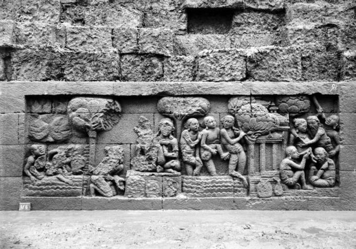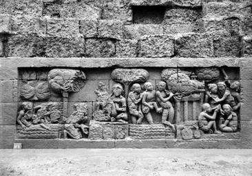 | Keywords: COLLECTIE TROPENMUSEUM Reliëf O 90 op de verborgen voet van de Borobudur TMnr 10015827.jpg nl Negatief Negatief waarop reliëf O 90 van de verborgen voet van de Borobudur te zien is De verborgen voet van de Borobudur is de oorspronkelijke basis van het Buddhistische heiligdom dat rond 800 gebouwd is In een latere fase van de bouw werd deze basis verborgen waarschijnlijk om verzakking te verkomen De verborgen voet loopt om het hele bouwwerk heen en bevat 160 reliëfs die tezamen de Mahakarmawibhangga verbeelden een Mahayanistische tekst die de werking van de leer van Karma uiteenzet Deze leerrede wordt aan Buddha toegeschreven en handelt over oorzaak en gevolg N J Krom en Th van Erp duiden in hun standaardwerk over de Borobudur Beschrijving van Barabudur Den Haag Martinus Nijhoff 1920-1931 de reliëfs van de verborgen voet aan als serie O Op de reliëfs zijn voorbeelden van de theorie uitgebeeld goede daden hebben goede gevolgen en slechte daden hebben slechte gevolgen De reliëfs vallen in twee delen uiteen O 1 tot en met O 117 verbeelden een aantal daden die leiden tot één en hetzelfde gevolg De reliëfs O 118 tot en met O 160 tonen verschillende gevolgen van één oorzaak De uiteenzetting van de leer begint bij de trap aan de oostzijde en ontrolt zich met de klok mee om het bouwwerk heen De reliëfs moeten dan ook gelezen worden van rechts naar links Lange tijd was onbekend wat op de reliëfs van de verborgen voet stond afgebeeld Hoewel de reliëfs al in 1885 waren ontdekt door Dr Ir J W IJzerman 1851-1932 kon de Franse geleerde Sylvain Lévi pas in 1929 op het zesde Congres van het Oostersch Genootschap constateren dat het op de verborgen voet ging om een Buddhistische tekst Mahakarmawibhangga Lévi had in 1922 een manuscript uit 1411 met deze tekst ontdekt in Kathmandu Nepal De tekst bleek populair in de Burdhistische wereld te zijn en een aantal verwante teksten te hebben twee Chinese werken waarvan één vertaald was in 582 door Gautama Dharmaprajna en één tussen 980 en 1000 door T'ien si Tsai Daarnaast bevat de Tibetaanse Kanjur twee werken met de titel Karmawibhangga In 1933 publiceerde de archeoloog N J Krom een uitgebreide analyse van het Mahakarmawibhangga op de reliëfs van de bedolven voet Hierin legt hij een relatie tussen de afbeeldingen op de reliëfs en de tekstpassages in het Mahakarmawibhangga Reliëf O 90 bevindt zich aan de westzijde van de Borobudur en zou in navolging van de hier vooraf gaande reliëfs moeten corresponderen met de vijftiende paragraaf van het Mahakarmawibhangga Echter deze paragraaf is op de verborgen voet van de Borobudur vervangen door een uitgebreide behandeling van de hellen; zeven reliëfs zijn gewijd aan de hellen De reliëfs O 86 tot en met O 89 beelden de acht grote hellen af Sanjiwa Kalasutra Samghata Raurawa Maharaurawa Tapana Pratapana en Awici Ieder van deze vier reliëfs toont twee keer een oorzaak en twee keer een gevolg in één van de hellen Op de reliëfs O 90 tot en met O 92 worden waarschijnlijk de bijhellen afgebeeld utsada's Op O 90a zien we een misdaad; een aantal personen is aan het drinken en één van hen omhelst een vrouw O 90b geeft hiervoor de straf weer; dezelfde personen staan in het water en trekken daaruit hun voeten omhoog met pijnlijke gebaren De linkerhelft van O 90 met daarop de oorzaak is zwaar beschadigd Op O 90c zien we een man die knielt tegenover twee anderen Wat er precies gebeurt is niet te zien De straf in de hel is te zien op O 90d en speelt zich weer in het water af maar deze keer zitten de slachtoffers in het water Uit N J Krom Het Karmawibhangga op Barabudur Mededeelingen der koninklijke academie van wetenschappen afdeeling letterkunde deel 76 serie B No 8 Amsterdam Noordhollandsche Uitgevers-Maatschappij 1933 238 Bronnen A J Bernet Kempers Borobudur Mysteriegebeuren in steen Verval en restauratie Oudjavaans volksleven Wassenaar 1973/gewijzigde herdruk ; Van Erp Th Krom N J Beschrijving van Barabudur Den Haag Martinus Nijhoff 1920-1931 ; N J Krom Het Karmawibhangga op Barabudur Mededeelingen der koninklijke academie van wetenschappen afdeeling letterkunde deel 76 serie B No 8 Amsterdam Noordhollandsche Uitgevers-Maatschappij 1933 Reliëf O 90 op de verborgen voet van de Borobudur 1890-1891 institution Tropenmuseum KIT-source 10015827 Creator Kassian Cephas KIT-license PD-old-100 Tropenmuseum Borobudur reliefs Photographs by Kassian Cephas Borobudur in 1890 Black and white photographs |