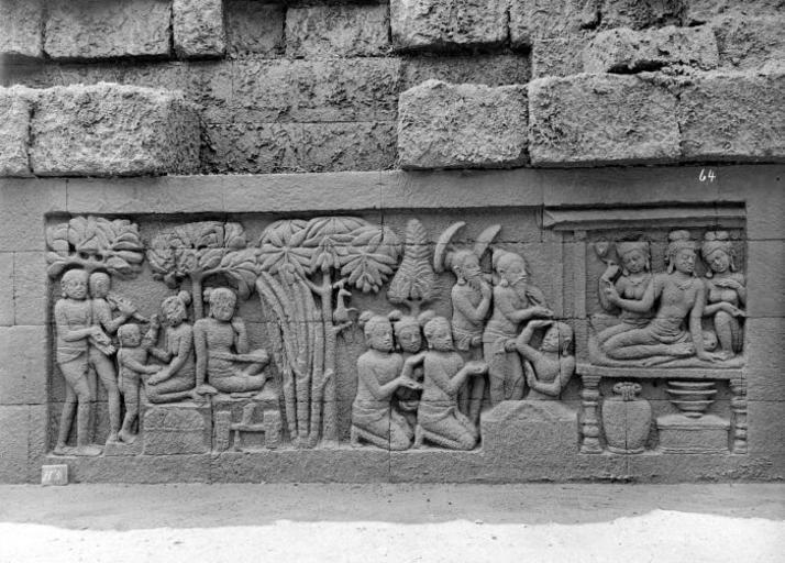 | Keywords: COLLECTIE TROPENMUSEUM Reliëf O 117 op de verborgen voet van de Borobudur TMnr 10015854.jpg nl Negatief Negatief waarop reliëf O 117 van de verborgen voet van de Borobudur te zien is De verborgen voet van de Borobudur is de oorspronkelijke basis van het Buddhistische heiligdom dat rond 800 gebouwd is In een latere fase van de bouw werd deze basis verborgen waarschijnlijk om verzakking te verkomen De verborgen voet loopt om het hele bouwwerk heen en bevat 160 reliëfs die tezamen de Mahakarmawibhangga verbeelden een Mahayanistische tekst die de werking van de leer van Karma uiteenzet Deze leerrede wordt aan Buddha toegeschreven en handelt over oorzaak en gevolg N J Krom en Th van Erp duiden in hun standaardwerk over de Borobudur Beschrijving van Barabudur Den Haag Martinus Nijhoff 1920-1931 de reliëfs van de verborgen voet aan als serie O Op de reliëfs zijn voorbeelden van de theorie uitgebeeld goede daden hebben goede gevolgen en slechte daden hebben slechte gevolgen De reliëfs vallen in twee delen uiteen O 1 tot en met O 117 verbeelden een aantal daden die leiden tot één en hetzelfde gevolg De reliëfs O 118 tot en met O 160 tonen verschillende gevolgen van één oorzaak De uiteenzetting van de leer begint bij de trap aan de oostzijde en ontrolt zich met de klok mee om het bouwwerk heen De reliëfs moeten dan ook gelezen worden van rechts naar links Lange tijd was onbekend wat op de reliëfs van de verborgen voet stond afgebeeld Hoewel de reliëfs al in 1885 waren ontdekt door Dr Ir J W IJzerman 1851-1932 kon de Franse geleerde Sylvain Lévi pas in 1929 op het zesde Congres van het Oostersch Genootschap constateren dat het op de verborgen voet ging om een Buddhistische tekst Mahakarmawibhangga Lévi had in 1922 een manuscript uit 1411 met deze tekst ontdekt in Kathmandu Nepal De tekst bleek populair in de Burdhistische wereld te zijn en een aantal verwante teksten te hebben twee Chinese werken waarvan één vertaald was in 582 door Gautama Dharmaprajna en één tussen 980 en 1000 door T'ien si Tsai Daarnaast bevat de Tibetaanse Kanjur twee werken met de titel Karmawibhangga In 1933 publiceerde de archeoloog N J Krom een uitgebreide analyse van het Mahakarmawibhangga op de reliëfs van de bedolven voet Hierin legt hij een relatie tussen de afbeeldingen op de reliëfs en de tekstpassages in het Mahakarmawibhangga Reliëf O 117 bevindt zich aan de noordzijde van de Borobudur N J Krom verbindt de paragrafen 37 38 38a en 39 van het Mahakarmawibhangga aan de reliëfs O 115 tot en met O 117 hoewel het moeilijk is deze reliëfs expliet aan één van deze paragrafen te verbinden XXXVII Wat is de daad waardoor het individu dat eraan verbonden is rijk en gierig wordt Antwoord door iemand hier wordt slechts een geringe gave gegeven aan een deugdzaam mens waardig die te ontvangen; zijn vrijgevige gezindheid herhaalt zich niet en hernieuwt zich niet Als deze onder de mensen geboren wordt wordt hij in grote rijke gefortuneerde geslachten geboren door de voortreffelijkheid van zijn gave maar omdat zijn vrijgevige gezindheid zich niet herhaald en zich niet hernieuwd heeft wordt hij gierig Zoals Dat individu wordt rijk en gierig XXXVIII Wat is de daad waardoor het individu dat eraan verbonden is arm en vrijgevig wordt Antwoord door een individu hier zijn veel gaven geschonken aan dieren en mensen van slecht gedrag zonder brahmaanse levenswandel; herhaaldelijk hernieuwt zich zijn vrijgevige gezindheid Als deze onder de mensen geboren wordt is hij arm en vrijgevig door die hernieuwde gaven maar omdat zijn gaven aan lieden gegeven zijn die het niet waard zijn ze te ontvangen is hij arm Zoals Dat is de daad waardoor het individu dat eraan verbonden is arm en vrijgevig wordt XXXVIIIa Wat is de daad waardoor het individu dat eraan verbonden is arm en gierig wordt Antwoord door een individu hier wordt niets gegeven aan deugdzame mensen en vrijgevige gezindheid is niet aanwezig Als deze onder de mensen geboren wordt is het in arme geslachten en omdat hij geen vrijgevige gezindheid had wordt hij gierig XXXIX Wat is de daad waardoor het individu dat eraan verbonden is rijk en vrijgevig wordt Antwoord door een individu hier zijn veel gaven geschonken aan deugdzame mensen die het waard zijn ze te ontvangen; deze vrijgevigheid herhaalt zich herhaaldelijk Als deze onder de mensen geboren wordt wordt hij door die daad in grote rijke gefortuneerde geslachten geboren en omdat herhaaldelijk zijn vrijgevige gezindheid zich heeft hernieuwd wordt hij vrijgevig Zoals Dat is de daad waardoor het individu dat eraan verbonden is rijk en vrijgevig wordt Op de reliëfs is het volgende te zien Op O 115a zien wij het schenken van kleding en andere zaken aan een aantal figuren in een paviljoen die op monniken lijken maar een ongewoon brede overslag langs het lichaam dragen Op O 115b is het gevolg afgebeeld een man in een paviljoen die niet de kleding van de hele aanzienlijken draagt maar toch iemand van welstand is te oordelen aan de versierselen potten en de kist met rijkdommen Hij maakt een afwerend gebaar tegen twee brahmanen tegenover hem van wie één de hand ophoudt Op reliëf O 116a zien wij een monnik geschenken krijgen Op O 116b krijgt een brahmaan giften O 116c toont een rijke man die aan het uitdelen is De hoofdpersoon op O 117 maakt een duidelijke afwijzing tegen de smekelingen brahmanen en anderen Een dienaar weert deze ook af Op O 117b zijn een arme grassnijder en een vrouw met haar rug tegen hem aan afgebeeld Zij weert een kind af dat bij een paar straatmuzikanten schijnt te horen De grassnijder kijkt de andere kant op Krom meent dat over reliëf O 116 geen twijfel mogelijk is; hier is een herhaalde schenking te zien aan waardige personen Het gevolg daarvan is een weldadige rijke Dit reliëf hoort bij paragraaf XXXIX van het Karmawibhangga O 117 schijnt het geval te zijn van arm en gierig dat niet in de tekst voorkomt; het gevolg van het niet schenken aan wie daarvoor in aanmerking komen Uit N J Krom