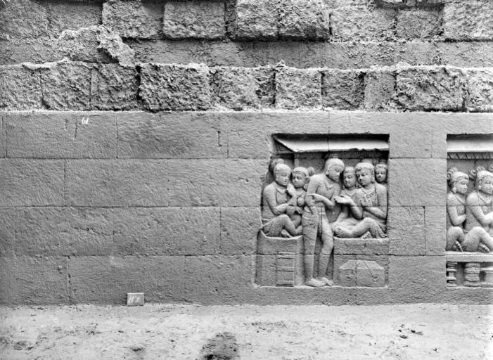| Keywords: COLLECTIE TROPENMUSEUM Reliëf O 120 op de verborgen voet van de Borobudur TMnr 10015857.jpg nl Negatief Negatief waarop reliëf O 120 van de verborgen voet van de Borobudur te zien is De verborgen voet van de Borobudur is de oorspronkelijke basis van het Buddhistische heiligdom dat rond 800 gebouwd is In een latere fase van de bouw werd deze basis verborgen waarschijnlijk om verzakking te verkomen De verborgen voet loopt om het hele bouwwerk heen en bevat 160 reliëfs die tezamen de Mahakarmawibhangga verbeelden een Mahayanistische tekst die de werking van de leer van Karma uiteenzet Deze leerrede wordt aan Buddha toegeschreven en handelt over oorzaak en gevolg N J Krom en Th van Erp duiden in hun standaardwerk over de Borobudur Beschrijving van Barabudur Den Haag Martinus Nijhoff 1920-1931 de reliëfs van de verborgen voet aan als serie O Op de reliëfs zijn voorbeelden van de theorie uitgebeeld goede daden hebben goede gevolgen en slechte daden hebben slechte gevolgen De reliëfs vallen in twee delen uiteen O 1 tot en met O 117 verbeelden een aantal daden die leiden tot één en hetzelfde gevolg De reliëfs O 118 tot en met O 160 tonen verschillende gevolgen van één oorzaak De uiteenzetting van de leer begint bij de trap aan de oostzijde en ontrolt zich met de klok mee om het bouwwerk heen De reliëfs moeten dan ook gelezen worden van rechts naar links Lange tijd was onbekend wat op de reliëfs van de verborgen voet stond afgebeeld Hoewel de reliëfs al in 1885 waren ontdekt door Dr Ir J W IJzerman 1851-1932 kon de Franse geleerde Sylvain Lévi pas in 1929 op het zesde Congres van het Oostersch Genootschap constateren dat het op de verborgen voet ging om een Buddhistische tekst Mahakarmawibhangga Lévi had in 1922 een manuscript uit 1411 met deze tekst ontdekt in Kathmandu Nepal De tekst bleek populair in de Burdhistische wereld te zijn en een aantal verwante teksten te hebben twee Chinese werken waarvan één vertaald was in 582 door Gautama Dharmaprajna en één tussen 980 en 1000 door T'ien si Tsai Daarnaast bevat de Tibetaanse Kanjur twee werken met de titel Karmawibhangga In 1933 publiceerde de archeoloog N J Krom een uitgebreide analyse van het Mahakarmawibhangga op de reliëfs van de bedolven voet Hierin legt hij een relatie tussen de afbeeldingen op de reliëfs en de tekstpassages in het Mahakarmawibhangga Reliëf O 120 bevindt zich aan de noordzijde van de Borobudur en heeft volgens N J Krom betrekking op één van de paragrafen 56 tot en met 58 van het Mahakarmawibhangga LVI Door het rijpen van het slechte pad van de daad de laster doen zich op de aarde dingen voor die pijn doen bij het aanraken kiezel grint enz ; ook ontstaat er door het rijpen van die daad moeilijkheid met verwanten en moelijkheid met vrienden en wordt de omgeving onenig LVII Door het rijpen van het slechte pad van de daad ruwe woorden ontstaan stof verstuivingen stofwervelingen stofregens; ook doen zich door het rijpen van die daad onaangename geluiden om te horen en onaangename gezichten voor LVIII Door het rijpen van het slechte pad van de daad onsamenhangende praat doen zich kloven afgronden enz voor; ook is het gevolg van het rijpen van die daad dat iemands woord niet aanvaard wordt O 120 moet betrekking hebben op één van de hierboven paragrafen Echter de linkerhelft is geheel onbewerkt gebleven en op O 120a is uitsluitend de oorzaak weergegeven Volgens Krom is dit waarschijnlijk dit laster zodat paragraaf LVI op dit reliëf is voorgesteld en de beide volgende paragrafen zijn overgeslagen Uit N J Krom Het Karmawibhangga op Barabudur Mededeelingen der koninklijke academie van wetenschappen afdeeling letterkunde deel 76 serie B No 8 Amsterdam Noordhollandsche Uitgevers-Maatschappij 1933 255 Bronnen A J Bernet Kempers Borobudur Mysteriegebeuren in steen Verval en restauratie Oudjavaans volksleven Wassenaar 1973/gewijzigde herdruk ; Van Erp Th Krom N J Beschrijving van Barabudur Den Haag Martinus Nijhoff 1920-1931 ; N J Krom Het Karmawibhangga op Barabudur Mededeelingen der koninklijke academie van wetenschappen afdeeling letterkunde deel 76 serie B No 8 Amsterdam Noordhollandsche Uitgevers-Maatschappij 1933 Reliëf O 120 op de verborgen voet van de Borobudur 1890-1891 institution Tropenmuseum KIT-source 10015857 Creator Kassian Cephas KIT-license PD-old-100 Tropenmuseum Borobudur reliefs Photographs by Kassian Cephas Borobudur in 1890 Black and white photographs |