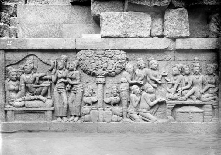 | Keywords: COLLECTIE TROPENMUSEUM Reliëf O 126 op de verborgen voet van de Borobudur TMnr 10015863.jpg nl Negatief Negatief waarop reliëf O 126 van de verborgen voet van de Borobudur te zien is De verborgen voet van de Borobudur is de oorspronkelijke basis van het Buddhistische heiligdom dat rond 800 gebouwd is In een latere fase van de bouw werd deze basis verborgen waarschijnlijk om verzakking te verkomen De verborgen voet loopt om het hele bouwwerk heen en bevat 160 reliëfs die tezamen de Mahakarmawibhangga verbeelden een Mahayanistische tekst die de werking van de leer van Karma uiteenzet Deze leerrede wordt aan Buddha toegeschreven en handelt over oorzaak en gevolg N J Krom en Th van Erp duiden in hun standaardwerk over de Borobudur Beschrijving van Barabudur Den Haag Martinus Nijhoff 1920-1931 de reliëfs van de verborgen voet aan als serie O Op de reliëfs zijn voorbeelden van de theorie uitgebeeld goede daden hebben goede gevolgen en slechte daden hebben slechte gevolgen De reliëfs vallen in twee delen uiteen O 1 tot en met O 117 verbeelden een aantal daden die leiden tot één en hetzelfde gevolg De reliëfs O 118 tot en met O 160 tonen verschillende gevolgen van één oorzaak De uiteenzetting van de leer begint bij de trap aan de oostzijde en ontrolt zich met de klok mee om het bouwwerk heen De reliëfs moeten dan ook gelezen worden van rechts naar links Lange tijd was onbekend wat op de reliëfs van de verborgen voet stond afgebeeld Hoewel de reliëfs al in 1885 waren ontdekt door Dr Ir J W IJzerman 1851-1932 kon de Franse geleerde Sylvain Lévi pas in 1929 op het zesde Congres van het Oostersch Genootschap constateren dat het op de verborgen voet ging om een Buddhistische tekst Mahakarmawibhangga Lévi had in 1922 een manuscript uit 1411 met deze tekst ontdekt in Kathmandu Nepal De tekst bleek populair in de Burdhistische wereld te zijn en een aantal verwante teksten te hebben twee Chinese werken waarvan één vertaald was in 582 door Gautama Dharmaprajna en één tussen 980 en 1000 door T'ien si Tsai Daarnaast bevat de Tibetaanse Kanjur twee werken met de titel Karmawibhangga In 1933 publiceerde de archeoloog N J Krom een uitgebreide analyse van het Mahakarmawibhangga op de reliëfs van de bedolven voet Hierin legt hij een relatie tussen de afbeeldingen op de reliëfs en de tekstpassages in het Mahakarmawibhangga Reliëf O 126 bevindt zich aan de noordzijde van de Borobudur en heeft volgens N J Krom betrekking op paragrafen 63 van het Mahakarmawibhangga LXIII Welke zijn de tien voordelen van het vereren van de heiligdommen van de Tathagata Antwoord men wordt schoon; men heeft een mooi geluid; men spreekt overtuigend; wanneer men in een gezelschap is gekomen wint men de genegenheid van het gezelschap; men is geliefd bij goden en mensen; men wordt een groot persoon; men heeft omgang met lieden die grote personen zijn; men heeft omgang met Buddha's en Buddha-hoorders; men heeft een rijke positie; men wordt herboren in de hemel; men bereikt spoedig het Parinirwana Dat zijn de tien voordelen van het vereren van de heiligdommen van de Tathagata Op O 124a zien we een aantal vereerders knielen en staan voor een tempelgebouwtje de inscriptie 'caityawandana' is het woord dat in de tekst gebruikt wordt voor een heiligdom De gevolgen van deze verdienstelijke daad zijn op O 124b O 125 en O 126 weergegeven De man die op O 124b in een paviljoen met een ander zit te praten onderscheidt zich door niets bijzonder maar is volgens de inscriptie 'suwarnawarna' goudkleurig Krom acht het waarschijnlijk dat het de bedoeling is geweest dat hij door de stuco-laag die ooit het monument bedekte ook daadwerkelijk goudkleurig leek Krom wijst erop dat 'suwarnawarna' niet in de tekst staat maar 'abhirupo' schoon De Franse oriëntalist en indologist Sylvain Lévi wijst erop dat goudkleurig wel in de Tibetaanse tekst voorkomt Onder het gevolg van de aanzienlijke man op O 125a bevinden zich muzikanten De inscriptie boven het reliëf luidt 'suswara' schoon van geluid Op O 125b zijn een paar rijk geklede mannen in gesprek volgens de inscriptie is dit een 'mahaujaskasamawadhana' een ontmoeting tussen grootmachtigen Op reliëf O 126a zien we een zeer rijke man met zijn gevolg Hij is 'bhogi' rijk gefortuneerd en heeft zelfs een aureool gekregen Hiermee is de beeldhouwer volgens Krom vooruit gelopen op het volgende tafereel waarboven de inscriptie 'swargga' hemel staat Dit tagereel is voorzien van een hemelboom juwelenpotten en kinnara's wezens die half mens half vogel zijn Een god met een aureool zit temidden van dienende vrouwen Uit N J Krom Het Karmawibhangga op Barabudur Mededeelingen der koninklijke academie van wetenschappen afdeeling letterkunde deel 76 serie B No 8 Amsterdam Noordhollandsche Uitgevers-Maatschappij 1933 259 Bronnen A J Bernet Kempers Borobudur Mysteriegebeuren in steen Verval en restauratie Oudjavaans volksleven Wassenaar 1973/gewijzigde herdruk ; Van Erp Th Krom N J Beschrijving van Barabudur Den Haag Martinus Nijhoff 1920-1931 ; N J Krom Het Karmawibhangga op Barabudur Mededeelingen der koninklijke academie van wetenschappen afdeeling letterkunde deel 76 serie B No 8 Amsterdam Noordhollandsche Uitgevers-Maatschappij 1933 Reliëf O 126 op de verborgen voet van de Borobudur 1890-1891 institution Tropenmuseum KIT-source 10015863 Creator Kassian Cephas Borobudur in 1890 Black and white photographs |