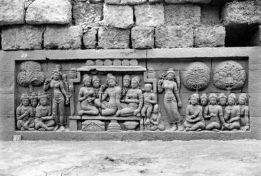 Keywords: COLLECTIE TROPENMUSEUM Reliëf O 142 op de verborgen voet van de Borobudur TMnr 10015878.jpg nl Negatief Negatief waarop reliëf O 142 van de verborgen voet van de Borobudur te zien is De verborgen voet van de Borobudur is de oorspronkelijke basis van het Buddhistische heiligdom dat rond 800 gebouwd is In een latere fase van de bouw werd deze basis verborgen waarschijnlijk om verzakking te verkomen De verborgen voet loopt om het hele bouwwerk heen en bevat 160 reliëfs die tezamen de Mahakarmawibhangga verbeelden een Mahayanistische tekst die de werking van de leer van Karma uiteenzet Deze leerrede wordt aan Buddha toegeschreven en handelt over oorzaak en gevolg N J Krom en Th van Erp duiden in hun standaardwerk over de Borobudur Beschrijving van Barabudur Den Haag Martinus Nijhoff 1920-1931 de reliëfs van de verborgen voet aan als serie O Op de reliëfs zijn voorbeelden van de theorie uitgebeeld goede daden hebben goede gevolgen en slechte daden hebben slechte gevolgen De reliëfs vallen in twee delen uiteen O 1 tot en met O 117 verbeelden een aantal daden die leiden tot één en hetzelfde gevolg De reliëfs O 118 tot en met O 160 tonen verschillende gevolgen van één oorzaak De uiteenzetting van de leer begint bij de trap aan de oostzijde en ontrolt zich met de klok mee om het bouwwerk heen De reliëfs moeten dan ook gelezen worden van rechts naar links Lange tijd was onbekend wat op de reliëfs van de verborgen voet stond afgebeeld Hoewel de reliëfs al in 1885 waren ontdekt door Dr Ir J W IJzerman 1851-1932 kon de Franse geleerde Sylvain Lévi pas in 1929 op het zesde Congres van het Oostersch Genootschap constateren dat het op de verborgen voet ging om een Buddhistische tekst Mahakarmawibhangga Lévi had in 1922 een manuscript uit 1411 met deze tekst ontdekt in Kathmandu Nepal De tekst bleek populair in de Burdhistische wereld te zijn en een aantal verwante teksten te hebben twee Chinese werken waarvan één vertaald was in 582 door Gautama Dharmaprajna en één tussen 980 en 1000 door T'ien si Tsai Daarnaast bevat de Tibetaanse Kanjur twee werken met de titel Karmawibhangga In 1933 publiceerde de archeoloog N J Krom een uitgebreide analyse van het Mahakarmawibhangga op de reliëfs van de bedolven voet Hierin legt hij een relatie tussen de afbeeldingen op de reliëfs en de tekstpassages in het Mahakarmawibhangga Reliëf O 142 bevindt zich aan de oostzijde van de Borobudur en heeft volgens N J Krom betrekking op paragraaf 67 van het Mahakarmawibhangga in de Chinese versie Ch G LXVII Welke zijn de tien voordelen van de gift van een vaandel Antwoord men is een standaard in de wereld en wordt door de koning ministers verwanten vrienden enz vereerd; men is rijk onafhankelijk schatten bezittend; zijn roem wordt naar alle hemelstreken verbreid; men is levenslang schoon van uiterlijk; in volgende incarnaties is men vast en onveranderlijk van gedrag; men heeft grote waardigheid en deugd; men wordt herboren in voorname families; men wordt herboren in de hemels; men bereikt spoedig het Parinirwana Dit zijn de voordelen van de gift van een vaandel Deze paragraaf heeft betrekking op de reliëfs O 141 tot en met O 143 Boven O 141 staat de inscriptie 'pataka' vaandels en zijn voorwerpen afgebeeld die door een groep vereerders aan het heiligdom worden aangeboden Reliëf O 142 is geheel gewijd aan de aanzienlijke rijke man met gevolg en de inscriptie 'adhya-bhogi' zeer gefortuneerd Op O 143 zien we een soortgelijke persoon die een hemelgod voorstelt Er is geen inscriptie maar we zien een hemelboom juwelenpotten en kinnara's half mens half vogel De beeldhouwer heeft zich beperkt tot de steeds terugkerende rijke positie en de hergeboorte in de hemel Uit N J Krom Het Karmawibhangga op Barabudur Mededeelingen der koninklijke academie van wetenschappen afdeeling letterkunde deel 76 serie B No 8 Amsterdam Noordhollandsche Uitgevers-Maatschappij 1933 263-264 Bronnen A J Bernet Kempers Borobudur Mysteriegebeuren in steen Verval en restauratie Oudjavaans volksleven Wassenaar 1973/gewijzigde herdruk ; Van Erp Th Krom N J Beschrijving van Barabudur Den Haag Martinus Nijhoff 1920-1931 ; N J Krom Het Karmawibhangga op Barabudur Mededeelingen der koninklijke academie van wetenschappen afdeeling letterkunde deel 76 serie B No 8 Amsterdam Noordhollandsche Uitgevers-Maatschappij 1933 Reliëf O 142 op de verborgen voet van de Borobudur 1890-1891 institution Tropenmuseum KIT-source 10015878 Creator Kassian Cephas KIT-license PD-old-100 Photographs by Kassian Cephas Tropenmuseum Borobudur reliefs Borobudur in 1890 Black and white photographs |