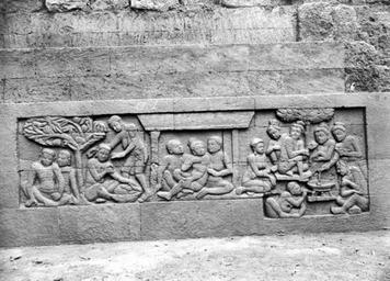 Keywords: COLLECTIE TROPENMUSEUM Reliëf O 15 op de verborgen voet van de Borobudur TMnr 10015753.jpg nl Negatief Negatief waarop reliëf O 15 van de verborgen voet van de Borobudur te zien is De verborgen voet van de Borobudur is de oorspronkelijke basis van het Buddhistische heiligdom dat rond 800 gebouwd is In een latere fase van de bouw werd deze basis verborgen waarschijnlijk om verzakking te verkomen De verborgen voet loopt om het hele bouwwerk heen en bevat 160 reliëfs die tezamen de Mahakarmawibhangga verbeelden een Mahayanistische tekst die de werking van de leer van Karma uiteenzet Deze leerrede wordt aan Buddha toegeschreven en handelt over oorzaak en gevolg N J Krom en Th van Erp duiden in hun standaardwerk over de Borobudur Beschrijving van Barabudur Den Haag Martinus Nijhoff 1920-1931 de reliëfs van de verborgen voet aan als serie O Op de reliëfs zijn voorbeelden van de theorie uitgebeeld goede daden hebben goede gevolgen en slechte daden hebben slechte gevolgen De reliëfs vallen in twee delen uiteen O 1 tot en met O 117 verbeelden een aantal daden die leiden tot één en hetzelfde gevolg De reliëfs O 118 tot en met O 160 tonen verschillende gevolgen van één oorzaak De uiteenzetting van de leer begint bij de trap aan de oostzijde en ontrolt zich met de klok mee om het bouwwerk heen De reliëfs moeten dan ook gelezen worden van rechts naar links Lange tijd was onbekend wat op de reliëfs van de verborgen voet stond afgebeeld Hoewel de reliëfs al in 1885 waren ontdekt door Dr Ir J W IJzerman 1851-1932 kon de Franse geleerde Sylvain Lévi pas in 1929 op het zesde Congres van het Oostersch Genootschap constateren dat het op de verborgen voet ging om een Buddhistische tekst Mahakarmawibhangga Lévi had in 1922 een manuscript uit 1411 met deze tekst ontdekt in Kathmandu Nepal De tekst bleek populair in de Burdhistische wereld te zijn en een aantal verwante teksten te hebben twee Chinese werken waarvan één vertaald was in 582 door Gautama Dharmaprajna en één tussen 980 en 1000 door T'ien si Tsai Daarnaast bevat de Tibetaanse Kanjur twee werken met de titel Karmawibhangga In 1933 publiceerde de archeoloog N J Krom een uitgebreide analyse van het Mahakarmawibhangga op de reliëfs van de bedolven voet Hierin legt hij een relatie tussen de afbeeldingen op de reliëfs en de tekstpassages in het Mahakarmawibhangga Reliëf O 15 bevindt zich aan de oostzijde van de Borobudur en correspondeert volgens N J Krom met de derde paragraaf van het Mahakarmawibhangga Wat is de daad die veel pijnen ten gevolge heeft Antwoord het geven van stompen en slagen; het zich verheugen in het geven van stompen en slagen; het prijzen van het geven van stompen en slagen; er tevreden over zijn dat deze gegeven worden; het kwellen van vader en moeder naar geest en lichaam en desgelijks van anderen deugdzame zwervende geestelijken de geest te doen lijden; tevreden zijn over de ziekte van een vijand; ontevreden zijn over het herstel van een vijand; het geven van ondeugdelijke geneesmiddelen aan zieken zo ook voedsel dat niet verteert Dat is de daad die veel pijnen ten gevolge heeft Uit N J Krom Het Karmawibhangga op Barabudur Mededeelingen der koninklijke academie van wetenschappen afdeeling letterkunde deel 76 serie B No 8 Amsterdam Noordhollandsche Uitgevers-Maatschappij 1933 221 De vele pijnen zijn te zien op het linkertafereel op de reliëfs O 13 tot en met O 15 Reliëf O 15a wordt gekookt; waarschijnlijk ondeugdelijke geneesmiddelen volgens Krom Op 15b en 15c is te zien welke slechte gevolgen die geneesmiddelen en onverteerbaar voedsel hebben Bronnen A J Bernet Kempers Borobudur Mysteriegebeuren in steen Verval en restauratie Oudjavaans volksleven Wassenaar 1973/gewijzigde herdruk ; Van Erp Th Krom N J Beschrijving van Barabudur Den Haag Martinus Nijhoff 1920-1931 ; N J Krom Het Karmawibhangga op Barabudur Mededeelingen der koninklijke academie van wetenschappen afdeeling letterkunde deel 76 serie B No 8 Amsterdam Noordhollandsche Uitgevers-Maatschappij 1933 Reliëf O 15 op de verborgen voet van de Borobudur 1890-1891 institution Tropenmuseum KIT-source 10015753 Creator Kassian Cephas KIT-license PD-old-100 Photographs by Kassian Cephas Tropenmuseum Borobudur reliefs Borobudur in 1890 Black and white photographs