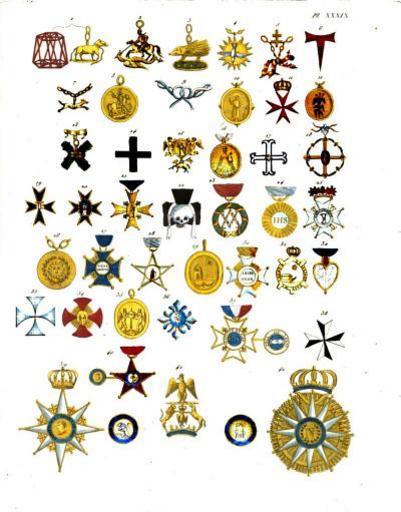 Keywords: Collection historique des ordres de chevalerie (XXXIX).jpg Planche n°XXXIX de la Collection historique des ordres de chevalerie civils et militaires ORDRES DU DÉVIDOIR ET DE LA LIONNE Ces institutions qui prirent naissance pendant les troubles qui agitèrent le royaume de Naples en 1386 et 1390 étaient plutôt des signes de ralliement que des ordres réguliers; ils cessèrent d'exister avec les différens qui divisaient la noblesse Les marques distinctives sont représentées Pl XXXIX n° 1 ; ORDRE DE SAINT-GEORGES en France i En 139o Philibert de Miolans institua cet ordre dans le comté de Bourgogne ; il nomma chevaliers les seigneurs qui s'assemblèrent pour la réception des reliques de saint Georges qui venaient d'Orient Ces chevaliers formèrent d'abord une confrérie et reçurent en i485 des statuts très-élendus d'après lesquels ils firent vœu de s'aider mutuellement de se délivrer s'ils étaient faits prisonniers et de veiller aux intérêts des veuves et des orphelins Pour y être admis il fallait faire preuve de seize quartiers de noblesse On prélend que c'est Louis XIV qui donna à l'ordre un rubanbleu avant lui ce ruban était rouge La marque distinctive est_ représentée Pl XXXIX n° 2 ; ORDRE DU CAMAIL ou DU PORC-EPIC en France Louis de France duc d'Orléans institua cet ordre en 1394 ; il eut pour but de s'attacher les grands et leur fit prêter le serment de défendre l'Etat la religion et le souverain Le nombre des chevaliers fut fixé à quinze; mais Louis XII l'augmenta Cet ordre n'a pas existé au-delà du 16 siècle Décoration Pl XXXIX n° 3 ; ORDRE DE LA COLOMBE et de LA RAISON Il paraît que Henri III vers 1399 distribua le collier de cet ordre à ses courtisans et les engagea à être fidèles à leurs épouses à défendre la religion les vierges les veuves les orphelins et à protéger les frontières du royaume contre les Barbares Pour être admis au nombre des chevaliers il fallait faire preuve de haute noblesse avoir été à la guerre ou avoir rendu au Roi de grands services Décoration Pl XXXIX n° 4 ; ORDRE DU DRAGON RENVERSÉ en Allemagne On croit que l'empereur Sigismond établit cet ordre en 1400 dans la vue d'exciter ses sujets contre les hérétiques Il fit prêter aux chevaliers le serment de défendre la religion et d'être implacables envers ses ennemis Cette institution eut quelques succès qui engagèrent le roi d'Aragon Alphonse V à établir le même ordre dans ses Etats; mais après la mort de ses fondateurs l'ordre dégénéra et négligé par les souverains ne tarda pas à s'éteindre Décoration Pl XXXIX n° 5 ; ORDRE DE SAINT-JACQUES-DU-HAUT-TAS ou DE LUCQUES Au commencement du 15e siècle cet ordre fut institué pour le service du grand hôpital de Lucques dont relevait l'hôpital de Saint-Jacques-du-Haut-Pas à Paris Louis XIV unit en 1672 les bieus de cet ordre à ceux de l'ordre de Saint-Lazare La croix Pl XXXIX n° 6 ; ORDRE DE L'HERMINE institué en 1461 par Ferdinand Ier roi de Naples en mémoire du pardon qu'il accorda à son beau-frère Monno-Marzanno qui avait voulu l'assassiner L'ordre était sous la pègle de saint Basile et avait pour devise Malo mori quàm fœdari je préfère la mort au déshonneur Pl XXXIX n° 7 ; ORDRE DE SAINT-GEORGES Frédéric III fonda cet ordre en 1472 comme un gage de son attachement et de sa reconnaissance envers la république de Gênes La croix était d'or formée en trèfle chargée en cœur d'une couronne et suspendue à un ruban d'or ; DAMES CHEVALIÈRES DE LA CORDELIÈRE Anne de Bretagne reine de France étant devenue veuve de Charles VIII institua cet ordre en 1498 pour se montrer affranchie des lois et du joug du mariage Elle fit faire un collier d'argent entrelacé qu'elle mit à l'entour de ses armes en forme d'écharpe avec cette devise J'ai le corps délié Ce cordon fut distribué aux dames de la cour pour le recevoir il fallait être d'une haute noblesse Pl XXXIX n° 9 ; ORDRE DE SAINT-PIERRE ET SAINT-PAUL à Rome Vers l'an 1520 l'ordre de Saint-Pierre fut institué par Léon X à dessein d'opposer la force aux Turcs qui ravageaient les côtes et l'état ecclésiastique En 1534 le pape Paul réunit cet ordre à celui de Saint-Paul qu'il venait de créer Le nombre des chevaliers fut de deux cents Décoration Pl XXXIX n° 10 ; ORDRE DE SAINT-GEORGES institué en 1i554 par le pape Paul III pour veiller à la défense de la ville de Ravenne et la délivrer des attaques desCortains Cet ordre a été aboli par le Pape Grégoire XIII Sa marque distinctive était une croix rouge à huit pointes surmontée d'une couronne d'or Pl XXXIX n° 11 ; ORDRE DU LIS institué par le pape Paul III en 1546 et confirmé en 1556 par Paul IV qui le mit au-dessus des autres ordres d'Italie La médaille Pl XXXIX n° 12 ; ORDRE DE TUNIS On suppose que Charles-Quint fonda cet ordre en 1535 lorsqu'il rétablit Muley-Hassan sur le trône de Tunis La décoration Pl XXXIX n° 13 était suspendue à un collier d'or enrichi de pierreries ; ORDRE DU TUSIN institué en 1562 par l'empereur Albert II La décoration était une croix verte sur un manteau blanc Pl XXXIX ; ORDRE DE L'AGNEAU DE DIEU insdtué l'an 1564 à Upsal par le roi de Suède Jean surnommé le Grand le jour de son couronnement et dans la vue dit-on de récompenser plusieurs seigneurs de la cour La médaille est représentéee Pl XXXIX n° i5 La devise était Deus protector noster Dieu est notre protecteur ; ORDRE DE NOTRE-DAME-DE-LORETTE à Rome Sixte-Quint créa cet ordre en 1587 pour marquer sa dévotion particulière en la sainte Vierge et pour donner la chasse aux voleurs de la Romagne Après la mort de son fondateur cet ordre tomba en décadence et disparut entièrement Marque distinctive Pl XXXIX n° 16 ; ORDRE DE LA CHARITÉ CHRÉTIENNE Henri III roi de France créa cet ordre en 1589 pour les officiers et soldats invalides à qui il donna à Paris une maison nommée la Charité chrétienne Il paraît que les troubles qui agitaie
