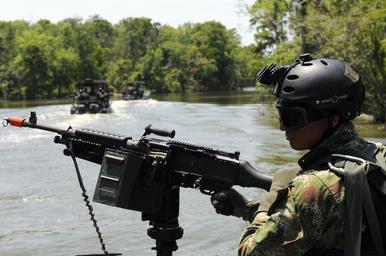 | Keywords: Colombian marine.JPG Juan Melo a Colombian marine and student in the Patrol Craft Officer course at Stennis Space Center Miss participates in a field training exercise June 30 2009 The course is at the U S Naval Small Craft Instruction and Technical Training School Melo is a student in The Western Hemisphere Institute for Security Cooperation The mission of Naval Small Craft Instruction and Technical Training School is to provide partner nation security forces with the highest level of riverine and littoral craft operations and maintenance technical training The Western Hemisphere Institute for Security Cooperation focuses on providing professional education and training to eligible persons of the nations of the Western Hemisphere within the context of the democratic principles set forth in the Charter of the Organization of American States http //www defenseimagery mil/imagery html guid 0fa94607e98d17f395f1abf5176cc1af44f78492 U S Navy photo by Mass Communication Specialist R J Stratchko/Released 2009-06-30 PD-USGov Colombian Naval Infantry M-240 machine gun Magazines with cartridge belt Blank-firing adaptor |