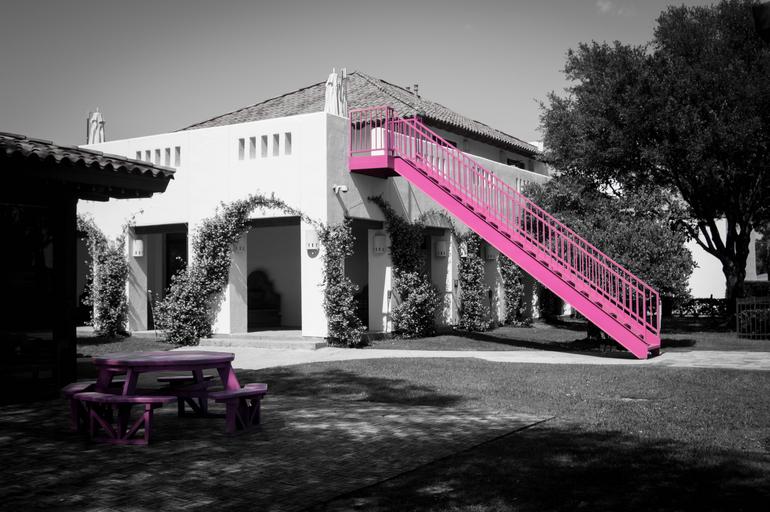 Keywords: color pink monochromatic building white modern grey black stairs table