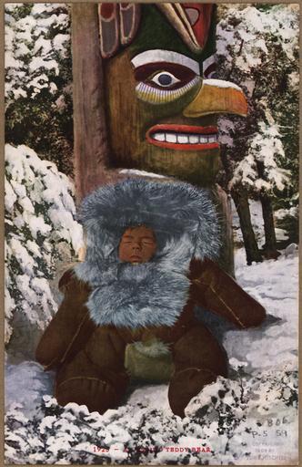 View Original:Color_post_card._"1923-An_Eskimo_Teddy_Bear."_(Eskimo_baby_sleeping_at_foot_of_a_totem_pole._-_NARA_-_297749.jpg (1943x3000)