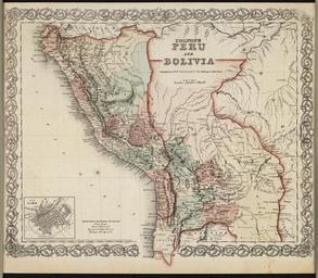 | Keywords: Colton’s Peru and Bolivia WDL11317.png Artwork ru Пе у и Боливия на ка те Колтона fr Le Pérou et la Bolivie de Colton en Colton s Peru and Bolivia zh 科尔顿的秘鲁和玻利维亚 pt Peru e Bolívia de Colton ar خريطة كولتون لبيرو وبوليفيا ru а этой ка те Пе у и Боливии 1855 года показаны топог афические особенности большие и малые го ода к епости еки и ечные по оги Г аницы госуда ств и егионов отмечены озовым зеленым желтым и синим цветами а в езке в левом нижнем углу п иведена ка та столицы Пе у Лимы В ве хнем п авом углу ка ты показана ека адей а по кото ой п оходит часть г аницы между Пе у и Б азилией и ека Амазонка ве ховья кото ой в Пе у получили название а аньон а в Б азилии - Солимоэс Ка та соп овождается п имечанием относительно судоходности еки Укаяли вплоть до места называемого Вуэльта-дель-Диабло Дьявольская излучина Атакама спо ная те ито ия после Вто ой Тихоокеанской войны 1879-1883 гг пе еданная Чили показана в составе Боливии Впе вые данная ка та была опубликована в 1855 году в Атласе ми а выпущенном издательством Колтона Компания J H Colton Company была основана в ью-Йо ке ве оятнее всего в 1831 году Джозефом Хатчинсом Колтоном 1800-1893 гг у оженцем штата ассачусетс Колтон получил лишь начальное об азование и не имел п актически никакой п офессиональной подготовки в области геог афии или ка тог афии Он п ев атил свою фи му в к упное издательство выпускающее ка ты и атласы скупая авто ские п ава на азличные ка ты и пе еиздавая их В 50-х годах XIX века после того как Колтон п ивлек к участию в бизнесе своих сыновей Джо джа Вулво та Колтона 1827-1901 гг и Ча лза Б Колтона 1832-1916 издательство стало носить название G W C B Colton Company П актически все ка ты изданные фи мой Колтона включая данную об амлены изоб ажениями пе еплетенных виног адных лоз цветов или геомет ических фигу fr Cette carte du Pérou et de la Bolivie datant de 1855 montre les caractéristiques topographiques les villes les villages les forts les rapides et les fleuves des deux pays Les frontières nationales et régionales sont dessinées en rose en vert en jaune et en bleu Un carton de Lima capitale du Pérou apparaît en bas à gauche Le fleuve Madeira qui forme la frontière entre le Pérou et Brésil et l'Amazone dont les sections supérieures sont appelées le Marañón au Pérou et le Solimões au Brésil sont tracés dans l'angle supérieur droit Une note indique la navigabilité du fleuve Ucayali jusqu'à la Vuelta del Diablo courbe du diable L'Atacama territoire contesté qui fut rattaché au Chili après la guerre du Pacifique de 1879 1883 fait partie de la Bolivie La carte parut à l'origine dans <em>Atlas du monde</em> de Colton en 1855 L'entreprise J H Colton and Company fut fondée à New York très probablement en 1831 par Joseph Hutchins Colton 1800 1893 Américain originaire du Massachusetts Colton avait seulement reçu une éducation de base et peu voire aucune formation officielle en géographie ou en cartographie Mais il parvint à faire de sa société une maison d'édition majeure de cartes et d'atlas en acquérant leurs droits d'auteur et en republiant d'autres cartes Dans les années 1850 la société devint G W C B Colton Company après que Colton s'associa avec ses fils George Woolworth Colton 1827 1901 et Charles B Colton 1832 1916 La quasi-totalité des cartes de Colton étaient encadrées de bordures décoratives de vignes de fleurs ou de formes géométriques entrelacées à l'instar de celle présentée ici en This 1855 map of Peru and Bolivia shows topographical features cities towns forts rapids and rivers National and regional boundaries are marked in pink green yellow and blue An inset map of Lima the capital of Peru appears in the lower-left-hand corner In the upper right are the River Madeira forming part of the border between Peru and Brazil and the Amazon the upper parts of which are known in Peru as the Marañón and in Brazil as the Solimões A note indicates the navigability of the River Ucayali up to the Vuelta del Diablo Devil s Bend Atacama a disputed territory that was transferred to Chile after the 1879 83 War of the Pacific is shown as part of Bolivia The map originally appeared in Colton s 1855 <em>Atlas of the World</em> J H Colton Company was founded in New York City most likely in 1831 by Joseph Hutchins Colton 1800 93 a Massachusetts native who had only a basic education and little or no formal training in geography or cartography Colton built the firm into a major publisher of maps and atlases by purchasing the copyrights to and republishing other maps In the 1850s the firm became G W C B Colton Company after Colton brought his sons George Woolworth Colton 1827 1901 and Charles B Colton 1832 1916 into the 