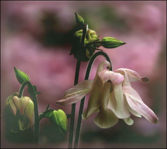 Keywords: columbine blossom bloom flower hahnenfußgewächs flora pink light pink rose filigree petals macro garden plant flowers spring tender bloom greenish close green nature hanging