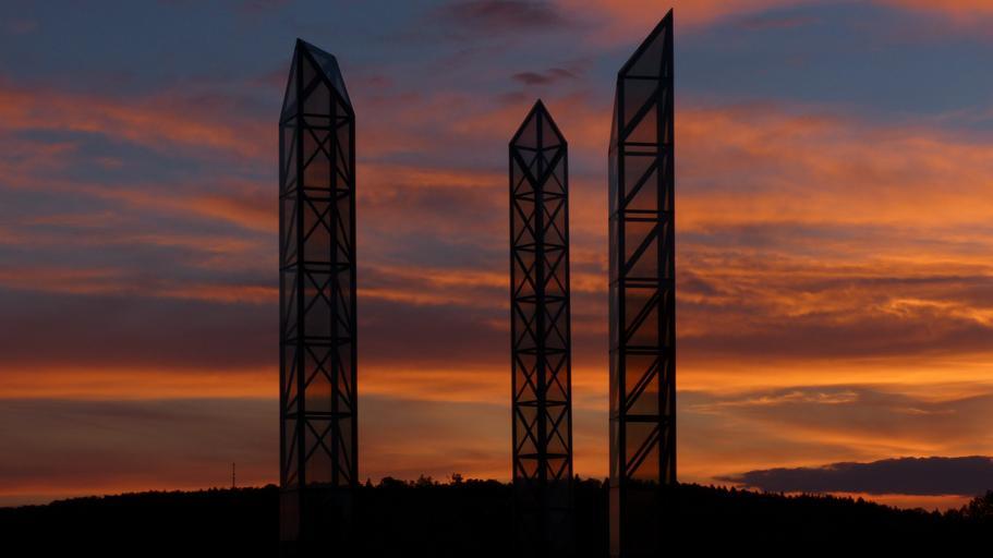 Keywords: columnar steles glass columns art artwork modern art sunset afterglow sky clouds uni irchel zurich switzerland university of irchel