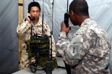 | Keywords: Combined Joint Task Force-Horn of Africa 130705-N-IZ662-400.jpg  en Japan Ground Self-Defense Force Sgt 1st Class Yasuyuki Iwashita left and U S Army Sgt Roderick Brown the communications section chief with the 1st Battalion 63rd Armor Regiment 2nd Armor Brigade Combat Team 1st Infantry Division test radio equipment July 5 2013 at Camp Lemonnier Djibouti U S and Japanese service members met to develop an emergency communications system to use in the event of a disaster Iwashita was assigned to the Japan Self-Defense Force Deployment Air Force for Counterpiracy Enforcement unit a Combined Joint Task Force-Horn of Africa coalition partner U S Navy photo by Mass Communication Specialist 1st Class Tom Ouellette/Released 2013-07-05 Petty Officer 1st Class Thomas Ouellette https //www dvidshub net/image/974967 130705-N-IZ662-400 2013-07-18 23 47 CAMP LEMONNIER DJ PD-USGov-Military-Navy Combined Joint Task Force - Horn of Africa Camp Lemonnier Images from DoD uploaded by Fæ People of the JGSDF |